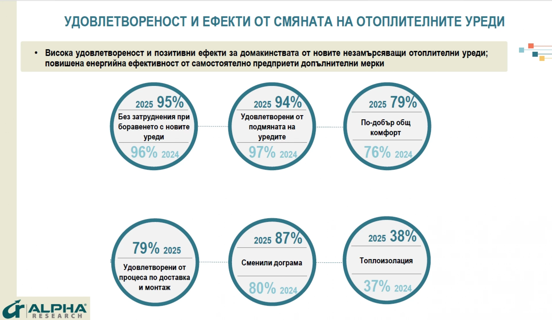 „Удовлетвореността от програмата е много висока – над 90% от участвалите домакинства оценяват положително ефекта от подмяната, а 93% биха я препоръчали на други. Виждат се обаче и проблеми, като особено важно е да се подобри гаранционното обслужване на новите уреди. Сред нежелаещите да подменят уредите си се капсулира твърдо ядро от около 28%. Това най-често са възрастни хора и хора с по-нисък социален статус, на които трябва да се обърне индивидуално внимание “, заяви Елена Лилова, изследовател в агенция „Алфа Рисърч“.