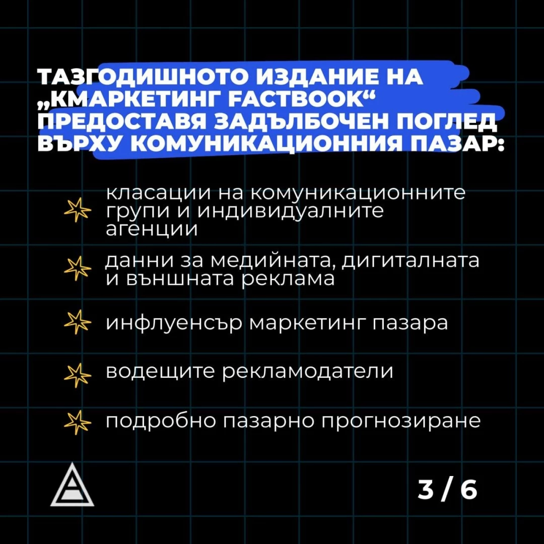 „кМаркетинг Factbook“ остава единствената класация в страната, която обединява приходните данни на комуникационните агенции и ги разделя по категории – комуникационни групи, дигитални и творчески агенции, медийни, PR и BTL агенции.