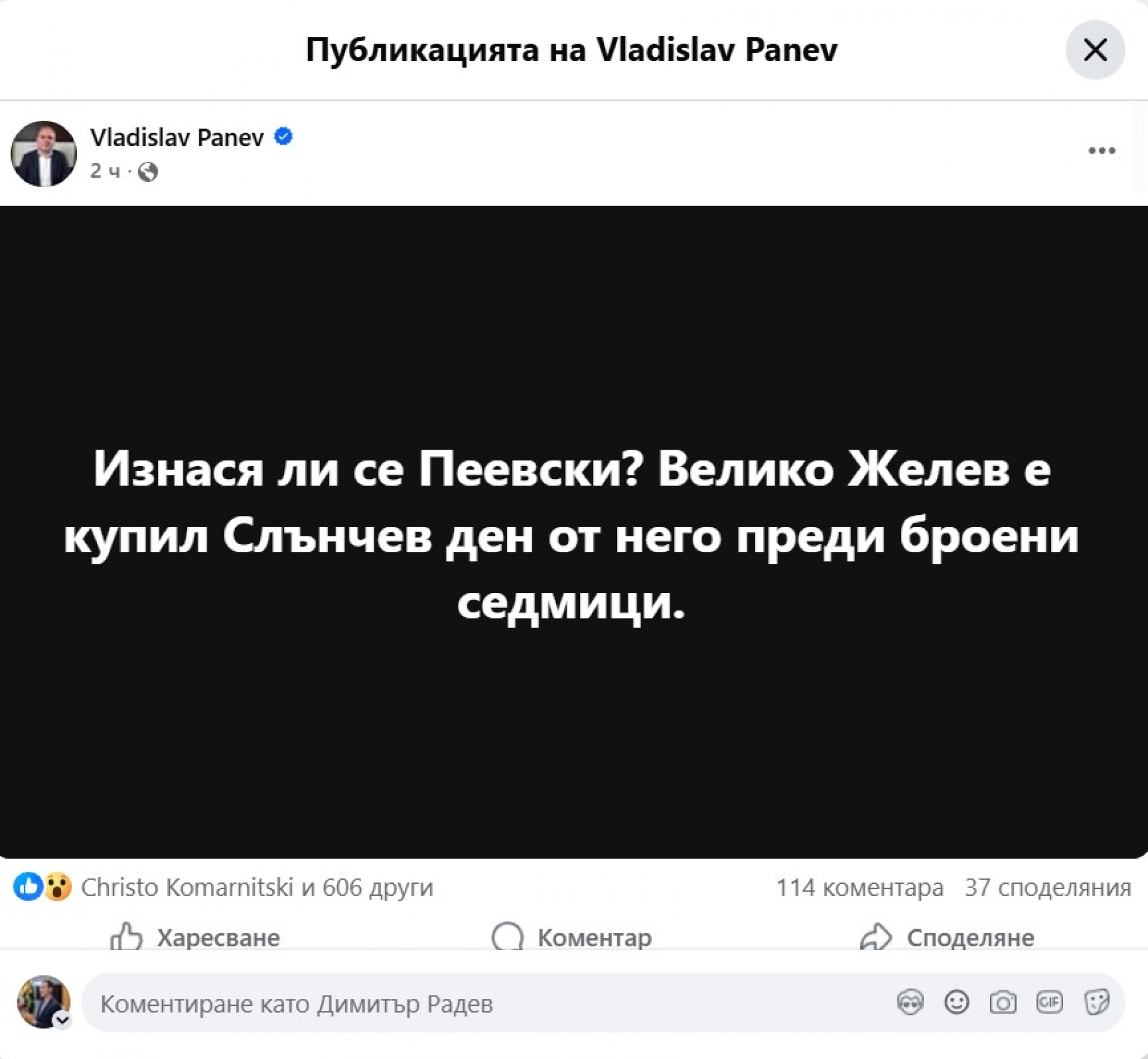 "Изнася ли се Пеевски? Велико Желев е купил "Слънчев ден" от него преди броени седмици" - такъв пост във Facebook публикува на 23 февруари Владислав Панев, бивш съпредседател на "Зелено движение" и бивш депутат от "Демократична България". Той не дава повече подробности, нито насочва към такива. Справка в Търговския регистър показва, че няма промяна в собствеността на "Слънчев ден" АД.