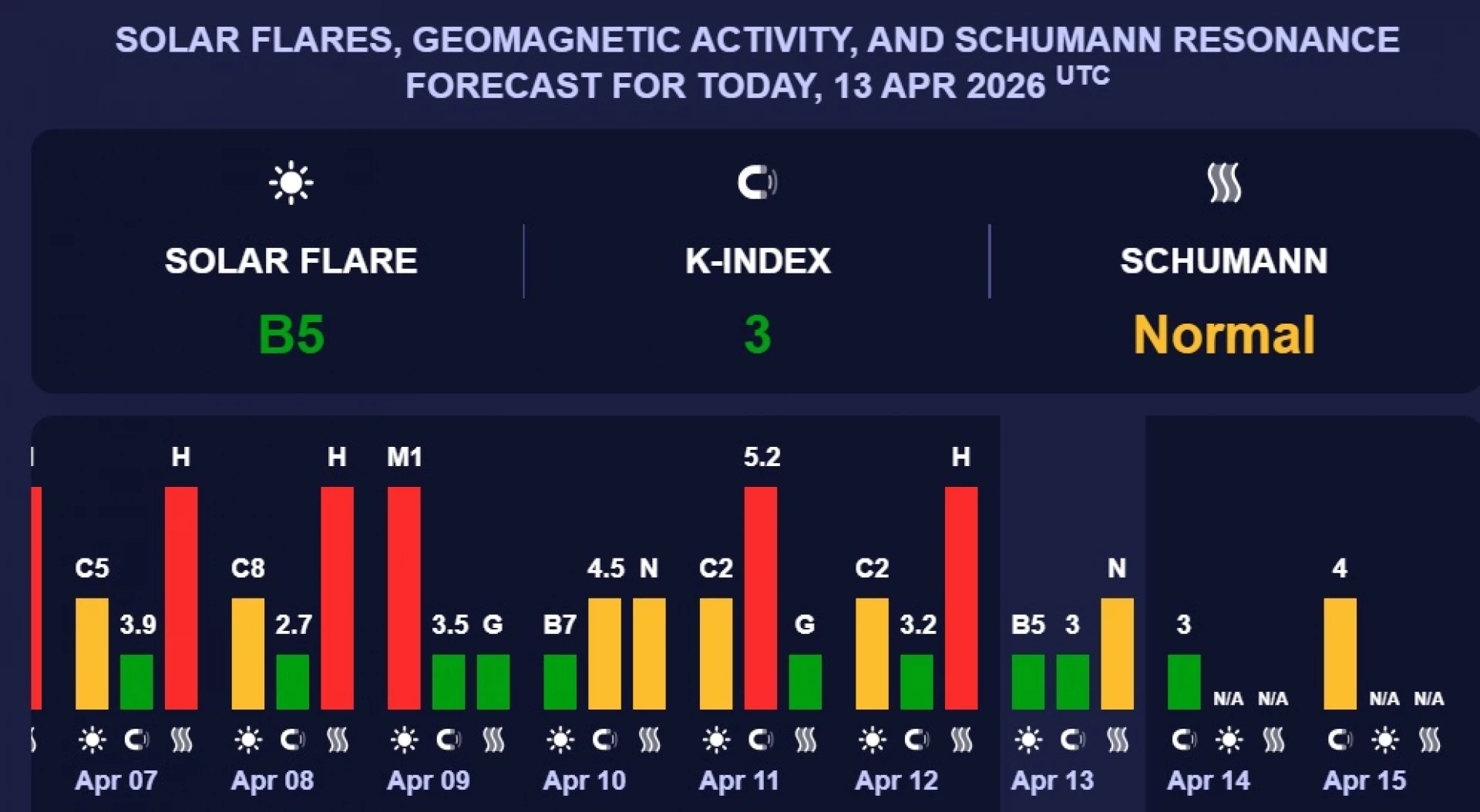 Според прогнозните данни на учените от Центъра за прогнозиране на космическото време към Националната администрация за океаните и атмосферата на САЩ на 13 април 2026 г. стойността на Кр индекса ще е - 3, а на 19 април - 4. Това може да доведе до здравословни неразположения при метеочувствителните хора. Тази прогноза не е окончателна и търпи промени в различните дни.