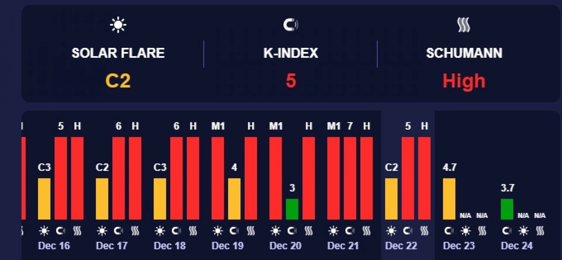 Според прогнозните данни на учените от Центъра за прогнозиране на космическото време към Националната администрация за океаните и атмосферата на САЩ също ще има два дни с повишена геомагнитна активност. На 22 и 23 декември 2025 г. стойността на Кр индекса ще е съответно от пета степен. Тези стойности могат да създадат здравословни проблеми у метеочувствителните хора. През останалите дни индексът ще е между 2 и 4. Тази прогноза не е окончателна и търпи промени в различните дни.