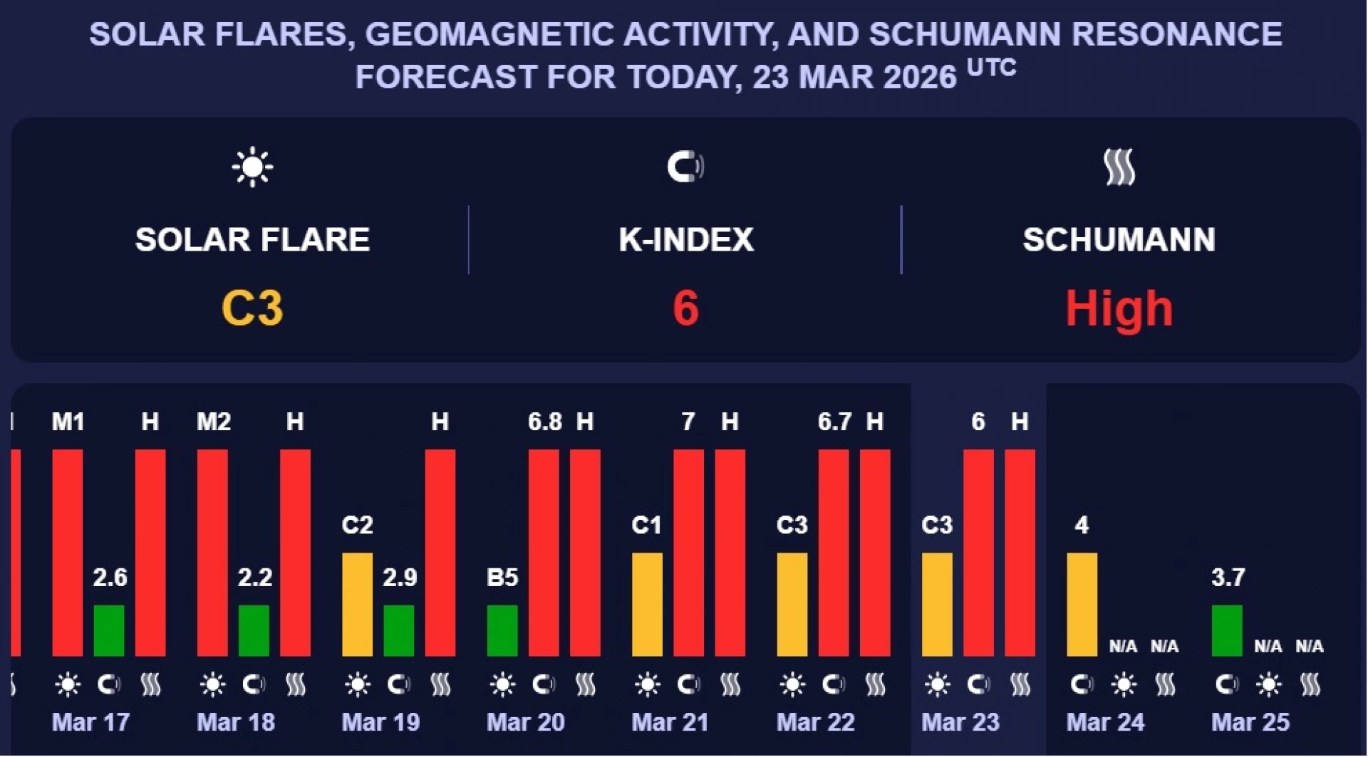 Според прогнозните данни на учените от Центъра за прогнозиране на космическото време към Националната администрация за океаните и атмосферата на САЩ на 23 март стойността на Кр индекса ще е - 6, а през следващите дни ще е между 2 и 3,  което може да доведе до здравословни неразположения при метеочувствителните хора. Тази прогноза не е окончателна и търпи промени в различните дни.