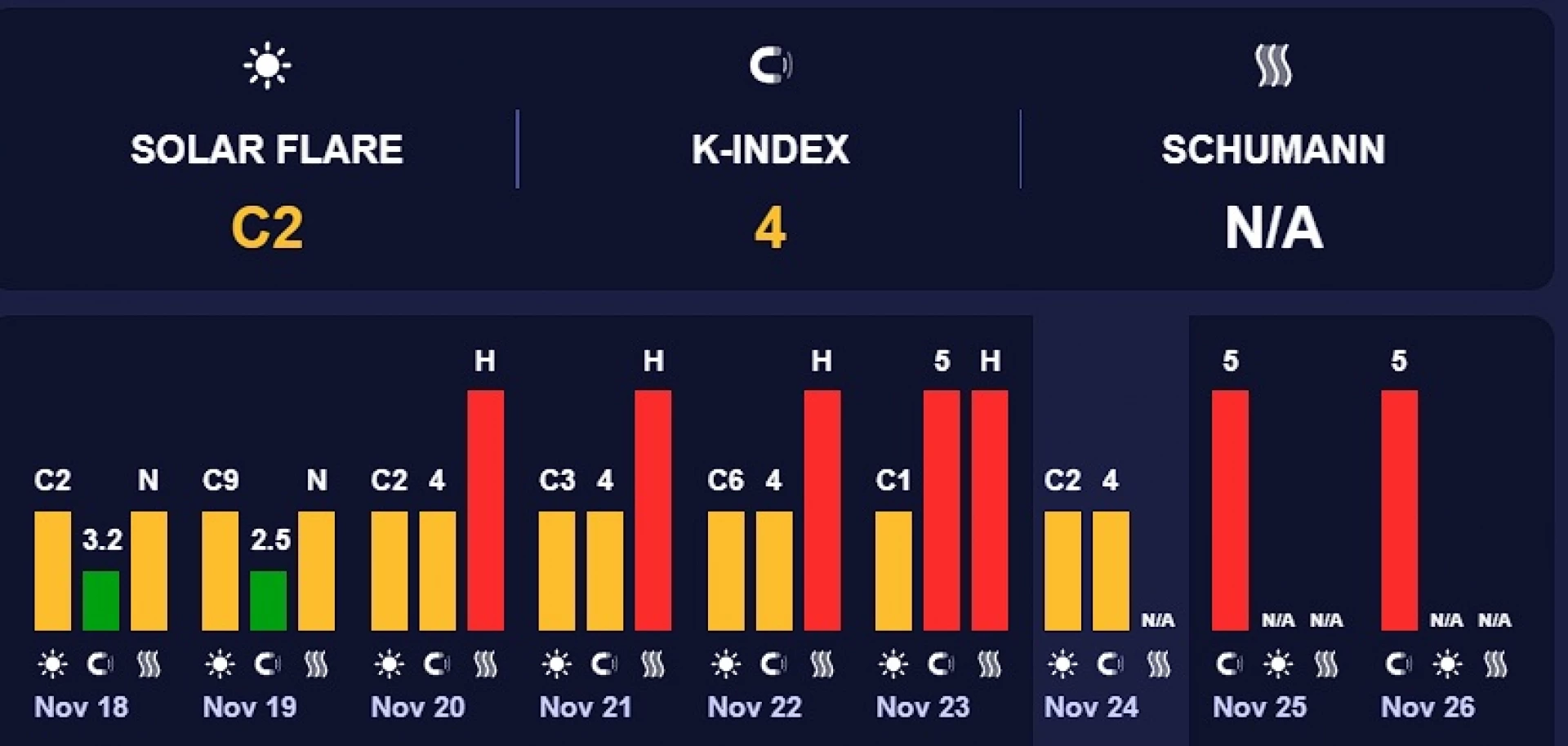 Според прогнозните данни на учените от Центъра за прогнозиране на космическото време към Националната администрация за океаните и атмосферата на САЩ ще има един ден с повишена геомагнитна активност. На 25,26 и 27 ноември стойността на Кр индекса ще е 5, което може да създаде здравословни проблеми у метеочувствителните хора. През останалите дни ще е 3. Тази прогноза не е окончателна и търпи промени в различните дни.