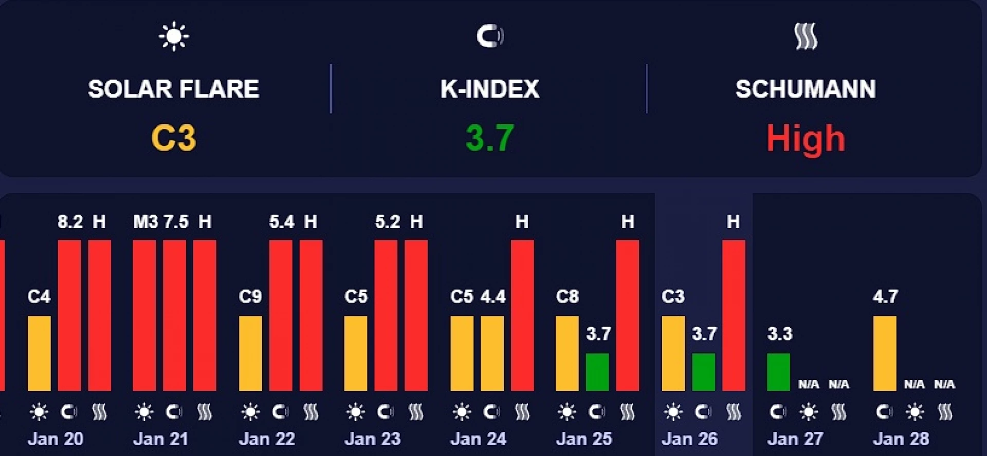 Според прогнозните данни на учените от Центъра за прогнозиране на космическото време към Националната администрация за океаните и атмосферата на САЩ на 28 и 29 януари стойността на Кр индекса ще е - съответно 5 и 4, а през останалите дни между 2 и 3. Тази прогноза не е окончателна и търпи промени в различните дни.