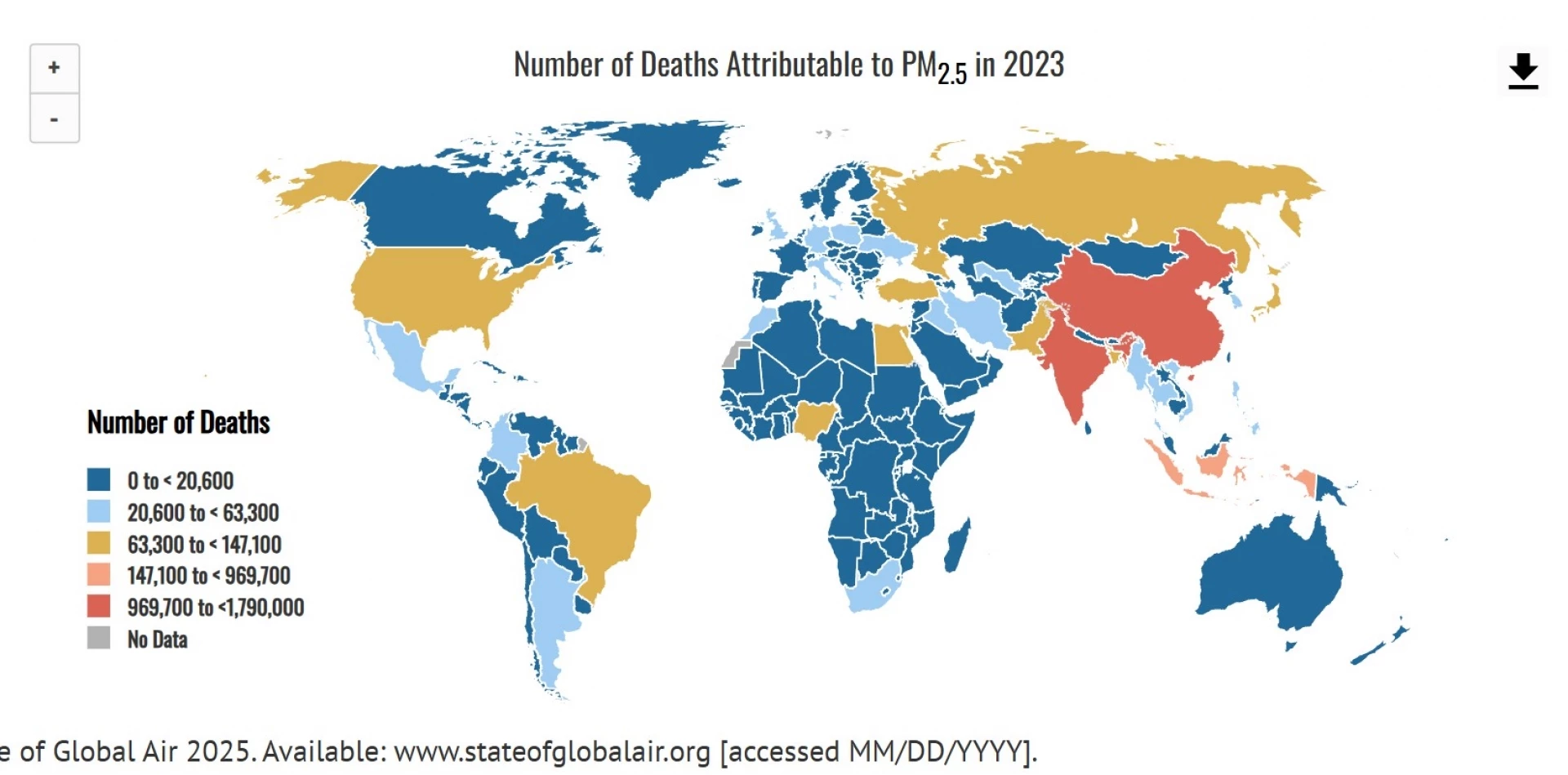 Тук страната ни попада в най-ниската група - до 20 600 смъртни случая, заедно с всичките съседни държави, с изключение на Турция. Тя отчита 71 000 смъртни случая, свързани с малките фини прахови частици през 2023 г. Всичко това, разбира се, зависи от броя на населението - Китай и Индия са най-засегнати. И все пак, данните са шокиращи - съответно 1,79 млн. и близо 970 хил. смъртни случая съответно.