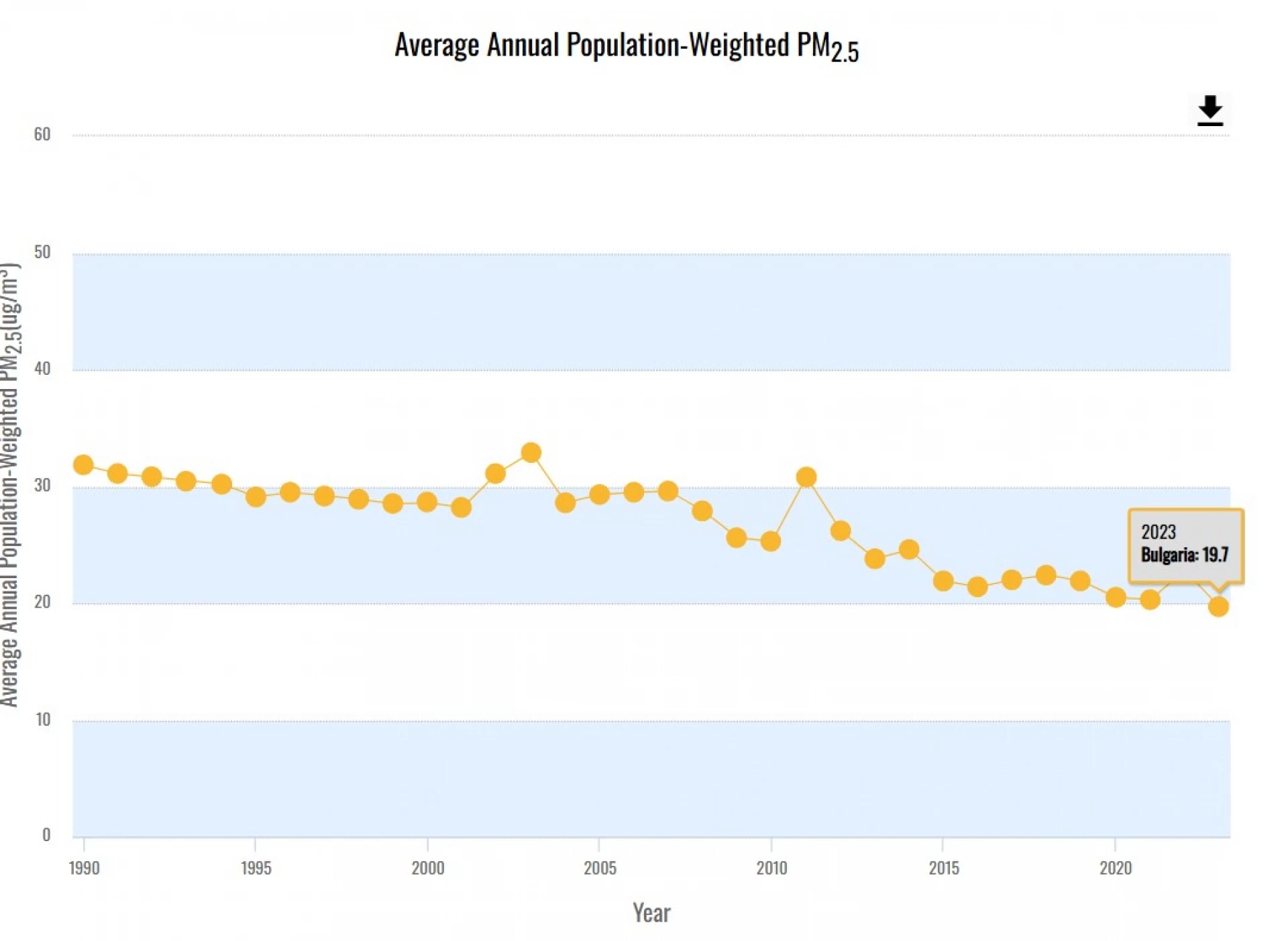 Броят смъртни случаи, дължащи се на PM2.5, през 2023 г. за България е 10 500 (71,6 на 100 хил. души), сочат данните. Това е спад от 2021 и 2022 г., когато са отчетени съответно 12 800 и 12 700 смъртни случая. За справка - през 2019 г. замърсяването на въздуха е било седма водеща причина за смъртност в страната, с приблизително 11 000 фатални случая.
