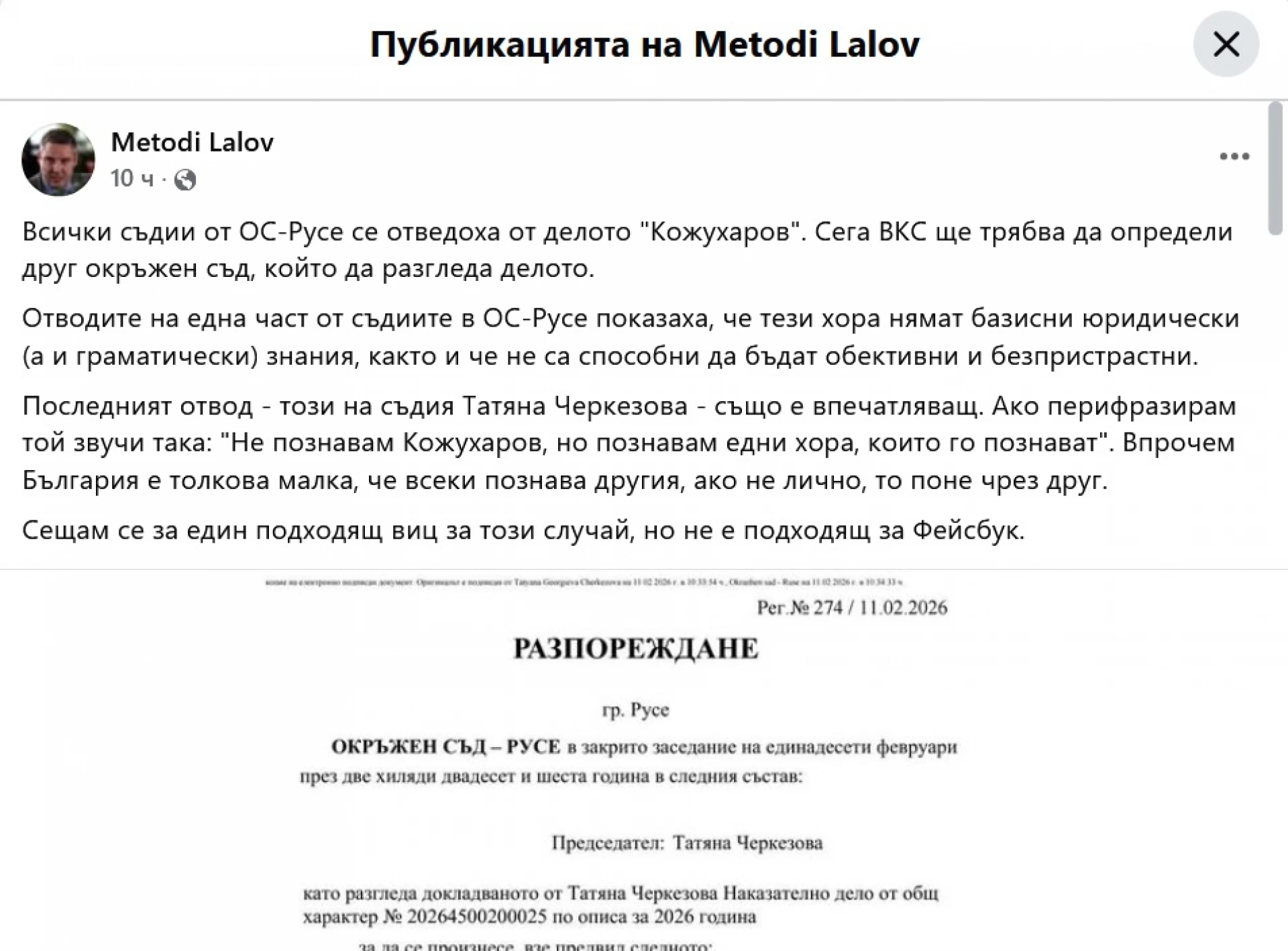 "Отводите на една част от съдиите показаха, че тези хора нямат базисни юридически (а и граматически) знания, както и че не са способни да бъдат обективни и безпристрастни. Последният отвод - този на съдия Татяна Черкезова - също е впечатляващ. Ако перифразирам той звучи така: "Не познавам Кожухаров, но познавам едни хора, които го познават", коментира Лалов.