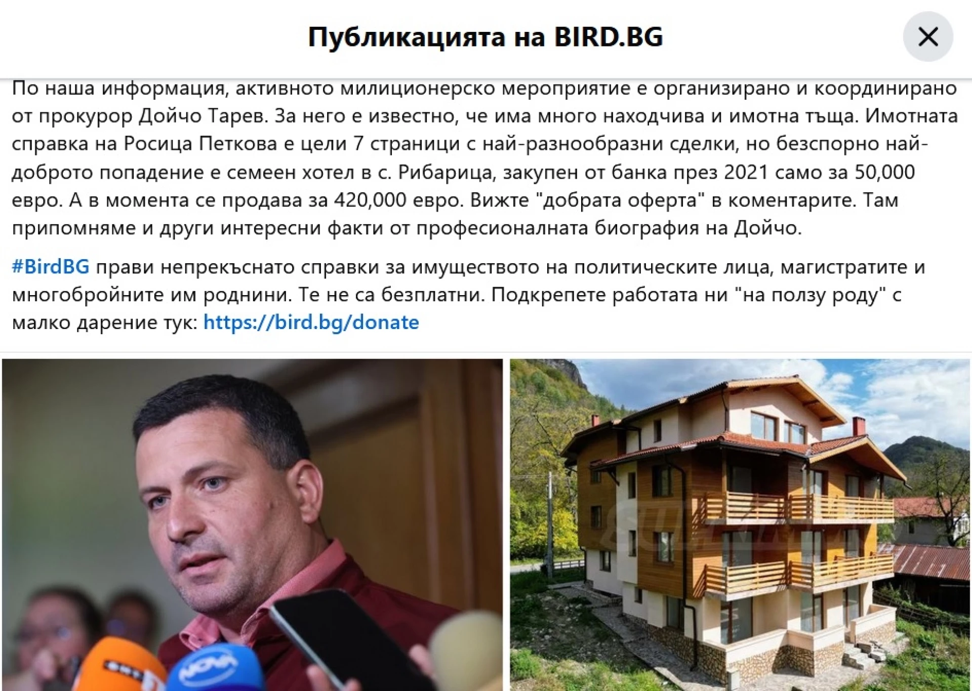 Междувременно, що се отнася до Емил Дечев, разследващите журналисти от Bird.bg посочиха името на прокурора, който води делото срещу служебния МВР министър - по тяхна информация това е Дойчо Тарев. Те обръщат внимание и на имотното състояние на тъщата на Тарев - ОЩЕ: Прокуратурата бързо започна разследване срещу вътрешния министър по искане на Пеевски