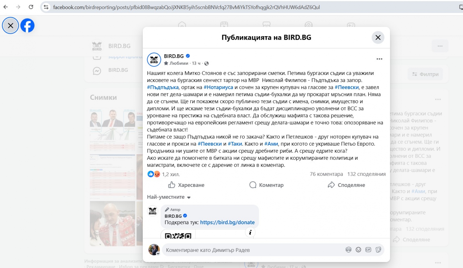Журналистът Димитър Стоянов от BIRD.bg е със запорирани сметки, съобщиха от разследващата медия вечерта на 7 април. Петима бургаски съдии са уважили исковете за запор на Николай Филипов - Пъдпъдъка, казват от изданието. Филипов е бургаски бизнесмен и бивш митничар. Запорите са за 25 000 евро след заведени нови пет дела. Според BIRD това са само половината от "делата шамари" (SLAPP), които Пъдпъдъка води срещу тях.
