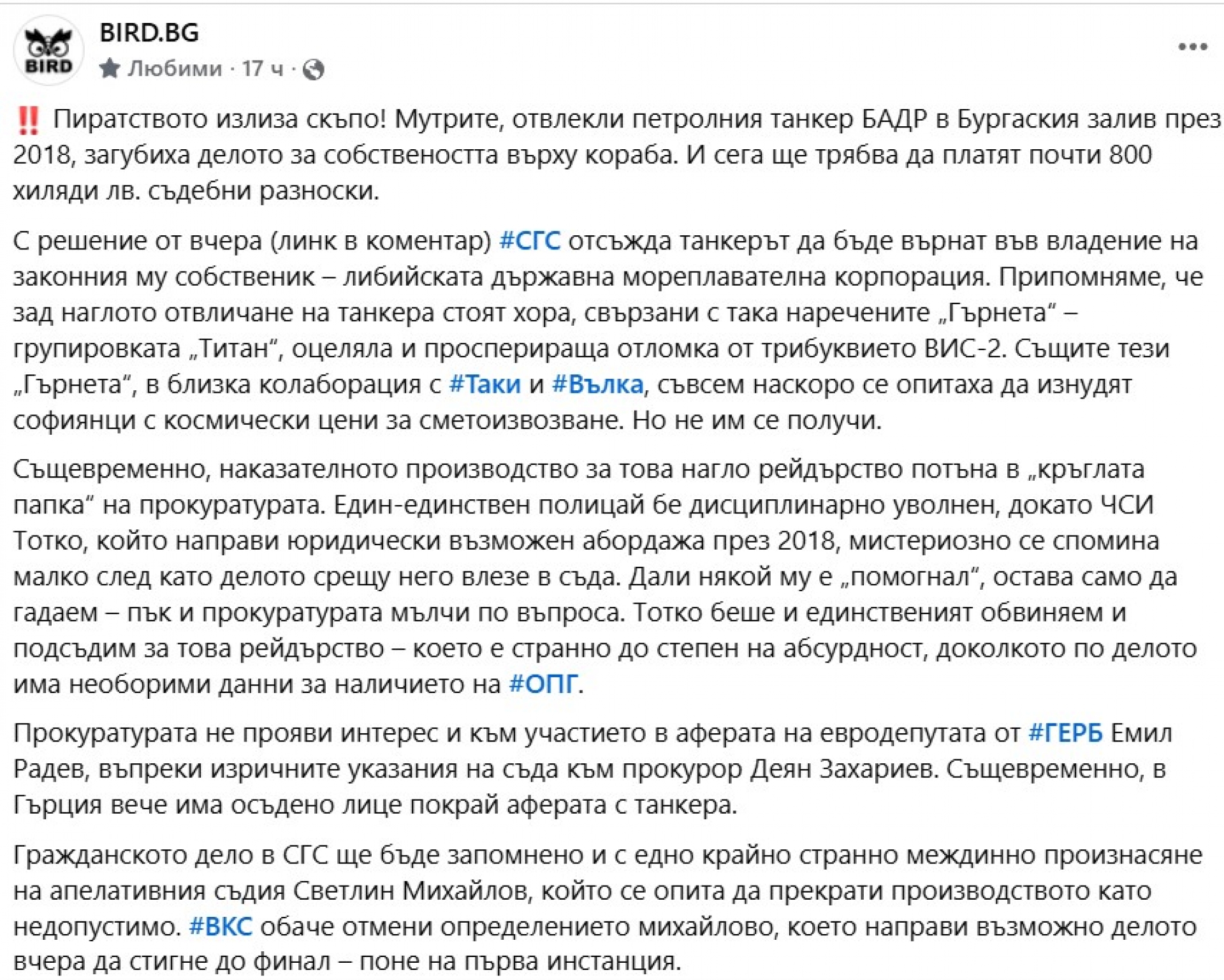 Според "Биволъ" в акцията е била замесена охранителна фирма, свързана с известен човек от "ъндърграунда". Разследващият сайт BIRD.bg твърди по повод актуалното решение на съда, че зад "отвличането" на танкера стоят хора, свързани с групировка, наречена "Гърнета".