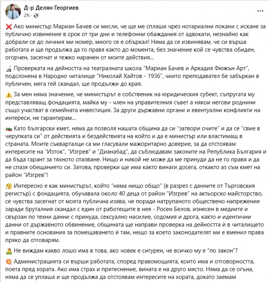 Ако министър Мариан Бачев си мисли, че ще ме сплаши чрез нотариални покани с искане за публично извинение в срок от три дни и телефонни обаждания от адвокати, незнайно как добрали се до личния ми номер, много се е объркал! Няма да се извинявам, че си върша работата и ще продължа да го правя както до момента, без значение кой се чувства обиден, огорчен, засегнат и тежко наранен от моите действия..., това написа кметът на столичния район "Изгрев" д-р Делян Георгиев в своя Facebook профил. Повод за емоционалната му публикация е криминалният скандал, при който бяха арестувани актьорът Росен Белов (който в момента е под домашен арест), председателят на най-голямата пациентска организация д-р Станимир Хасърджиев и други лица, които са обвинени в принуда с оръжие, насилие и дрогиране на 20-годишен младеж.