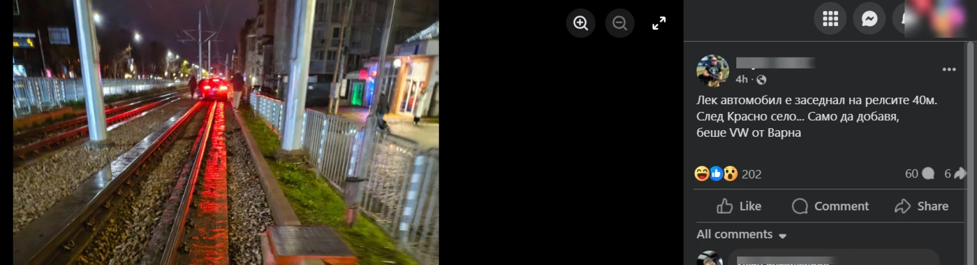 Според публикацията му се вижда, че колата е заседнала на релсите, макар да има заграждения и от двете страни на линията. Видно от снимката и коментарите, колата е VW с варненска регистрация. Няма яснота и детайли от МВР за инцидента от петък срещу събота през нощта. Още: Поредна трагедия на пътя: Трима души загинаха при челен удар между камион и кола край Търговище