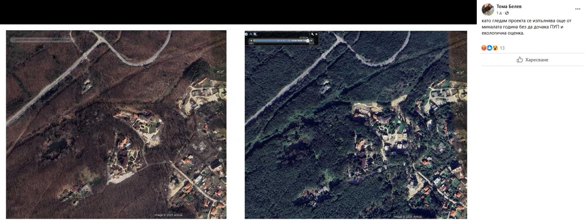 Белев прилага и сателитни снимки, като твърди, че на тях се вижда, че инвестиционният проект е стартирал преди да има одобрен ПУП и екологична оценка. А в отговорите под публикацията му участие взема и депутатът от "Възраждане" Коста Стоянов, който посочва, че от партията подали сигнали до прокуратурата, ДАНС, КПК и комисията за противодействие с корупцията в НС! Какъв сигнал е подаден - за незаконно строителство и изсичането на вековни гори. Как точно ДАНС, КПК и парламентарната антикорупционна комисия са с правомощия да се занимават с незаконно строителство и изсичане на гори е въпрос без отговор: