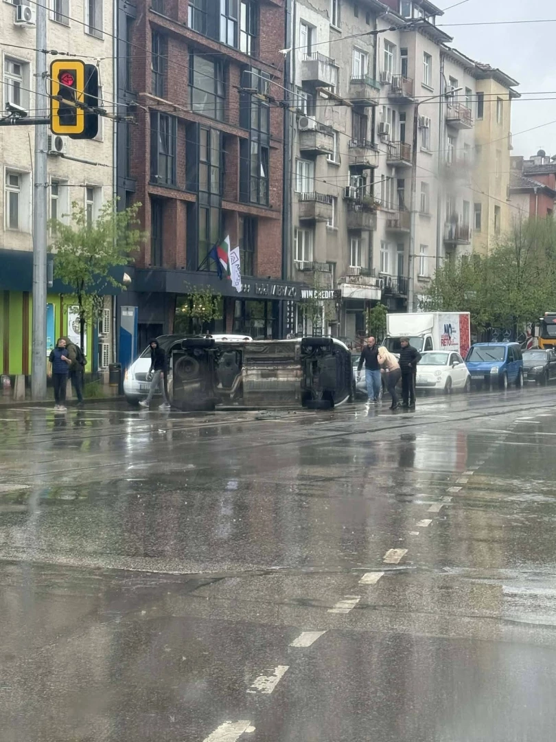 Линейка се обърна на булевардите „Христо Ботев“ и „Сливница“. Движението в района е блокирано. При катастрофата няма пострадали. На място са пристигнали екипи на полицията и още една линейка.