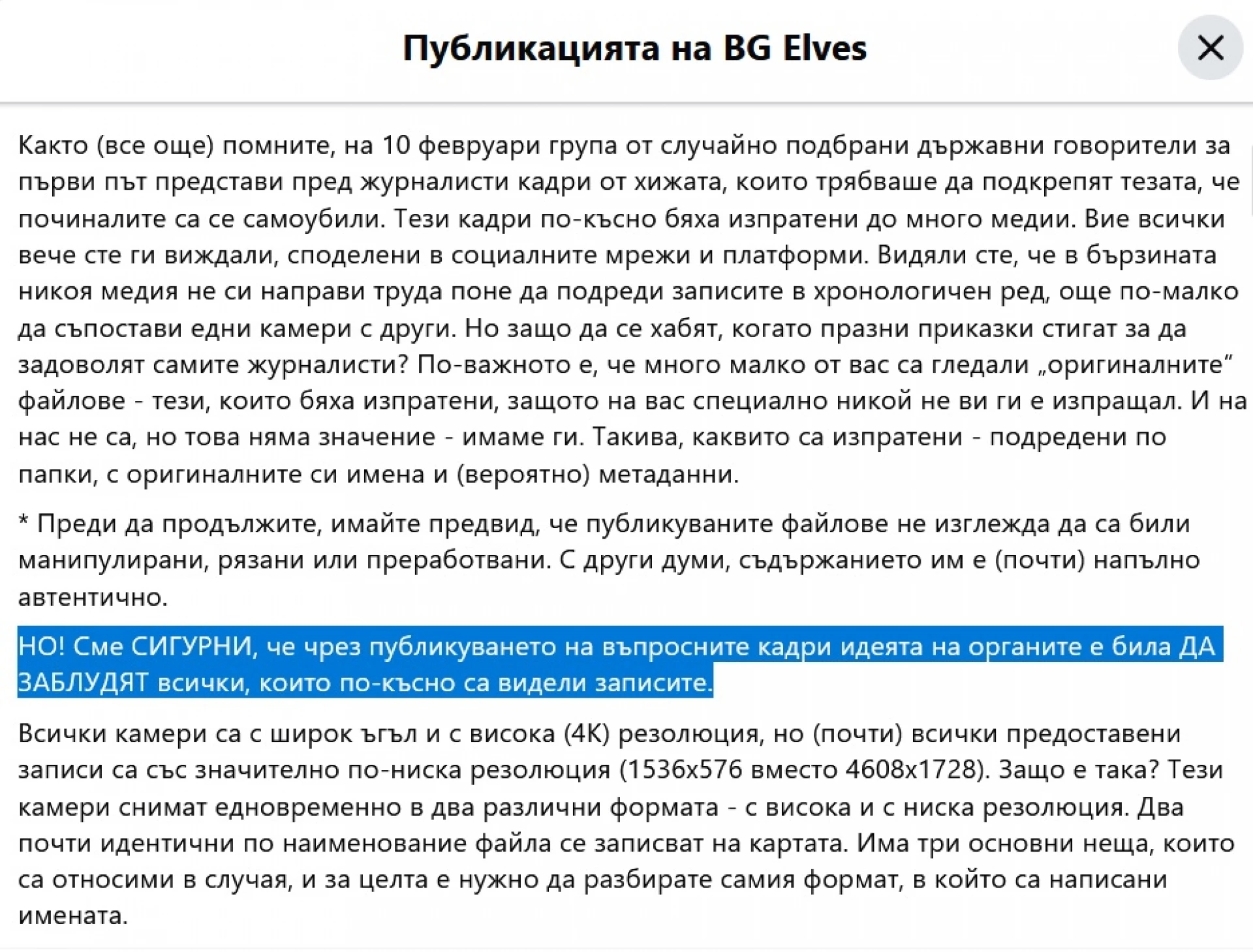 BG Elves акцентират на едно основно нещо – какви всъщност файлове със записи от хижа "Петрохан" досега бяха оповестени в разследването. Инициативата е категорична – видеокадрите как няколко мъже изпълняват "поклони" (всъщност беше многократно коментирано, че това е йога практика – има спорове доколко правилно се изпълнява), са всъщност записани 40 дни преди 1 февруари, когато изглежда поне три от общо шестте жертви са изгубили живота си. Защо се акцентира точно на този момент от живота в хижата и то след като в тези кадри Ивайло Калушев липсва, а на втората пресконференция на разследването беше внушено, че изпълнението на практиката предполага култ? Ако тези кадри датират от 21/22 декември 2025 г., когато е Зимното слънцестоене, това може да обясни "поклоните" - в много религии и духовни практики тогава /по изгрев/ се посреща раждането на новото Слънце, като се вярва, че слънчевата енергия пречиства. Съответно това дава съвсем различен ракурс в този епизод от случващото се.