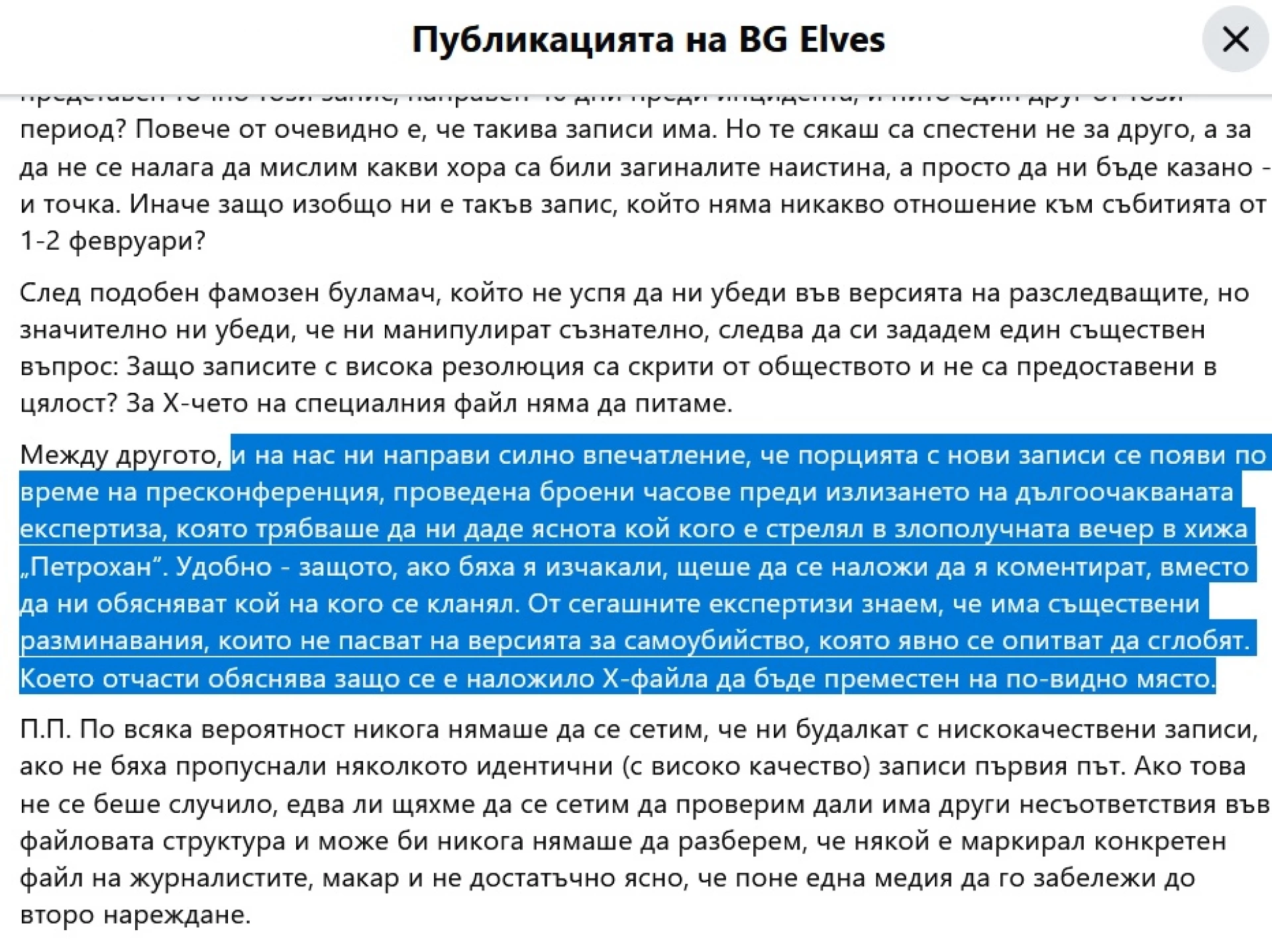 " (...) и на нас ни направи силно впечатление, че порцията с нови записи се появи по време на пресконференция, проведена броени часове преди излизането на дългоочакваната експертиза, която трябваше да ни даде яснота кой кого е стрелял в злополучната вечер в хижа "Петрохан". Удобно - защото, ако бяха я изчакали, щеше да се наложи да я коментират, вместо да ни обясняват кой на кого се кланял. От сегашните експертизи знаем, че има съществени разминавания, които не пасват на версията за самоубийство, която явно се опитват да сглобят. Което отчасти обяснява защо се е наложило Х-файла да бъде преместен на по-видно място“ - това са ключовите думи в разсъжденията на "Елфите". Въпросният Х-файл е точно този, който касае "поклоните".