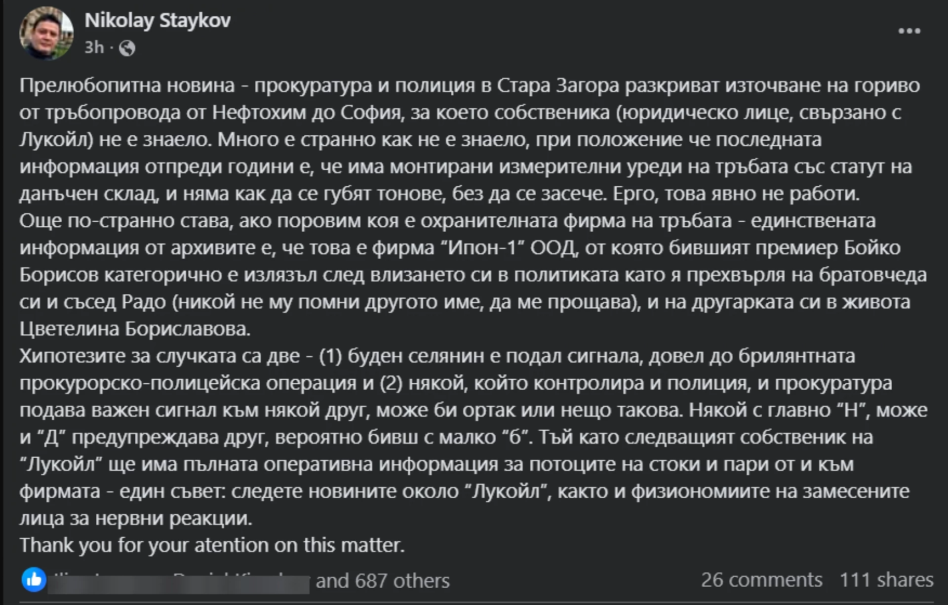 И още: "Прелюбопитна новина - Много е странно как не е знаело, при положение че последната информация отпреди години е, че има монтирани измерителни уреди на тръбата със статут на данъчен склад, и няма как да се губят тонове, без да се засече. Ерго, това явно не работи. Още по-странно става, ако поровим коя е охранителната фирма на тръбата - единствената информация от архивите е, че това е фирма “Ипон-1” ООД, от която бившият премиер Бойко Борисов категорично е излязъл след влизането си в политиката като я прехвърля на братовчеда си и съсед Радо (никой не му помни другото име, да ме прощава), и на другарката си в живота Цветелина Бориславова", пише още той.