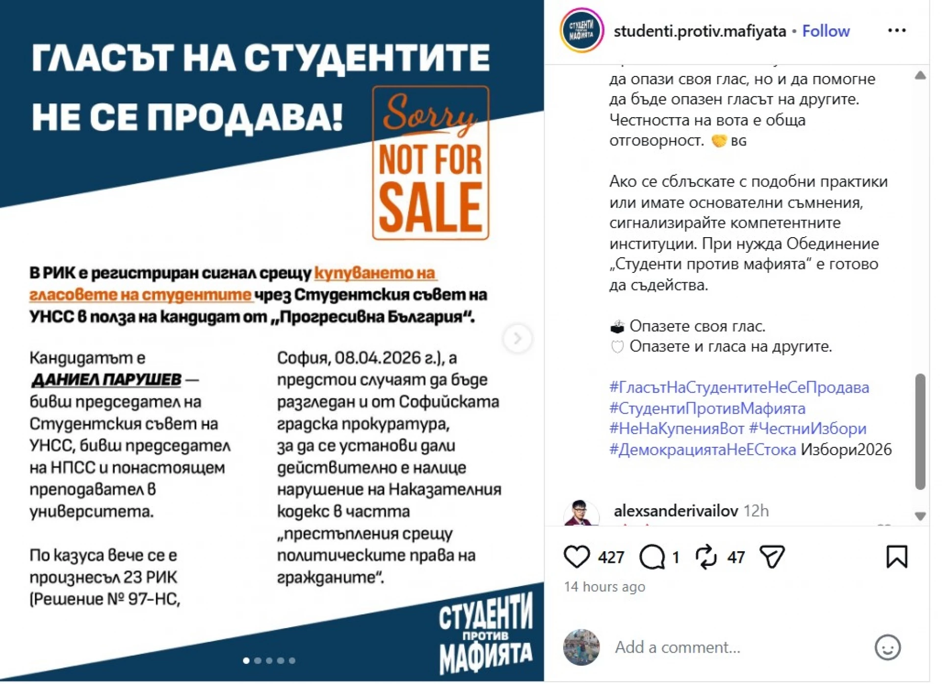 Сигнал за съмнение за купуване на гласове на студенти чрез Студентския съвет на УНСС в полза на кандидат от "Прогресивна България" е подаден до Централната избирателна комисия (ЦИК). Това съобщиха от Обединение „Студенти против мафията“. В него се твърди, че има нарушение на изборното законодателство чрез разпространение на съобщение във Viber, в което се предлага материална облага от 50 евро на студенти, в замяна на участие като застъпници на 19 април 2026 г. и задължително гласуване за конкретен кандидат - Даниел Парушев.