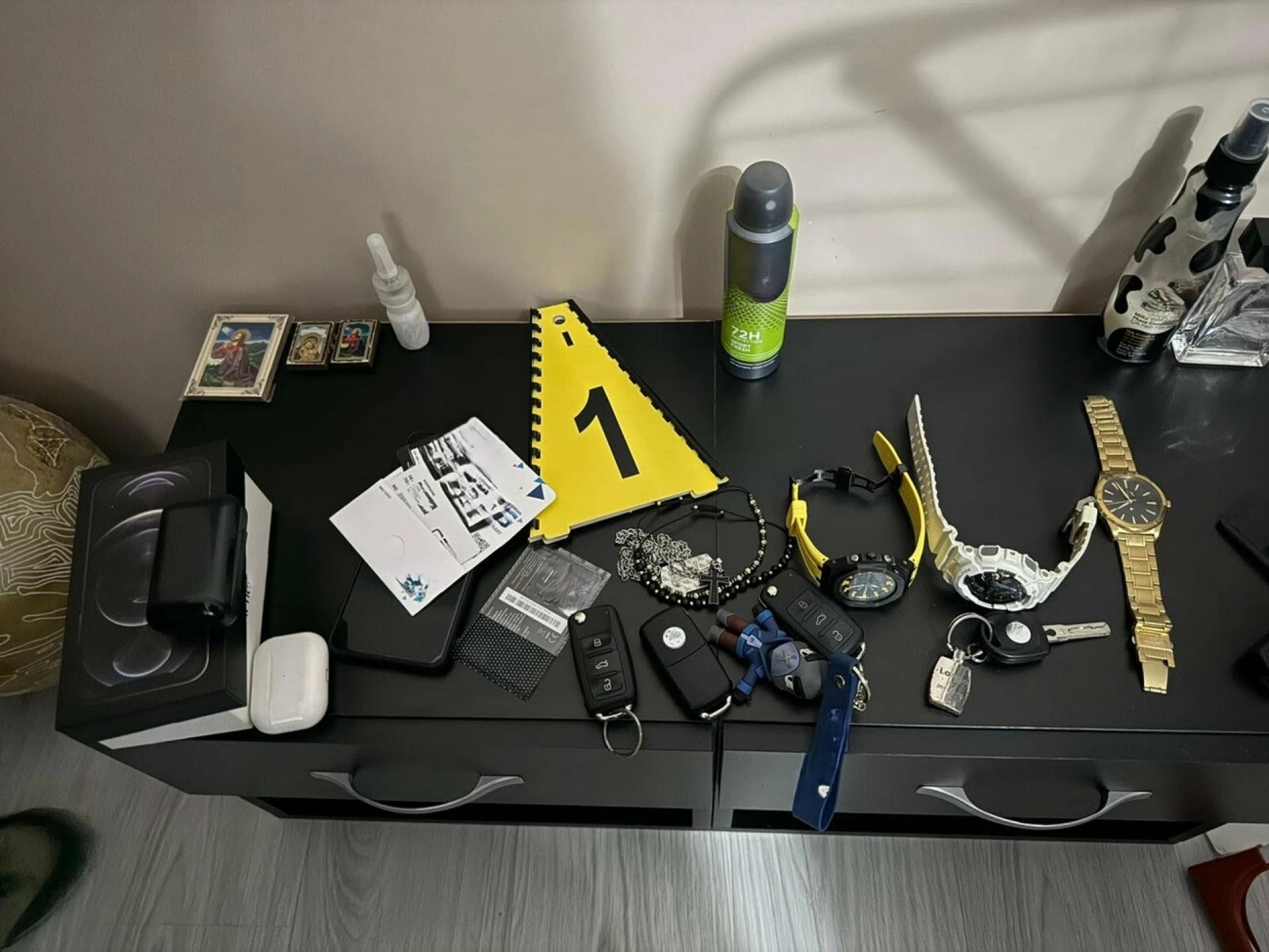 Иззети са мобилни телефони, сим карти на различни оператори, преносими компютри, неистински регистрационни табели за МПС, множество документи, текстилна маска, газов пистолет калибър 9 мм, както и 39 боеприпаса.