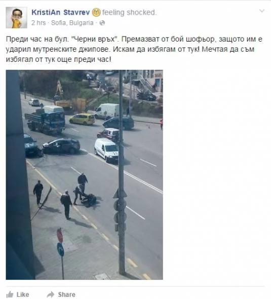"Преди час на бул. "Черни връх". Премазват от бой шофьор, защото им е ударил мутренските джипове. Искам да избягам от тук! Мечтая да съм избягал от тук още преди час!", написа Кристиян Ставрев в профила си във Facebook, който пръв сигнализира за инцидента и публикува снимка, на която се вижда как един мъж е легнал на земята, а други трима са се надвесили на него.