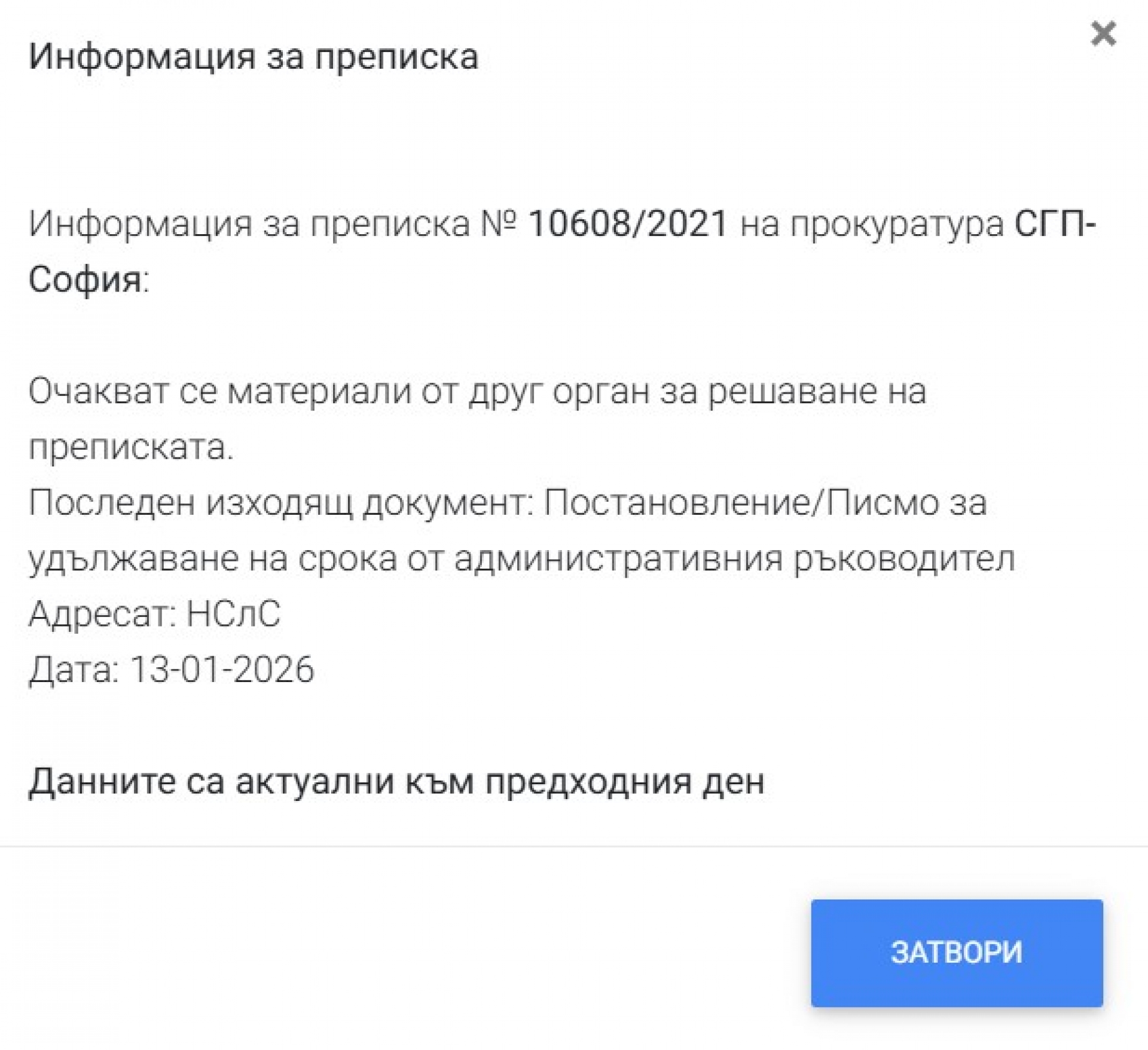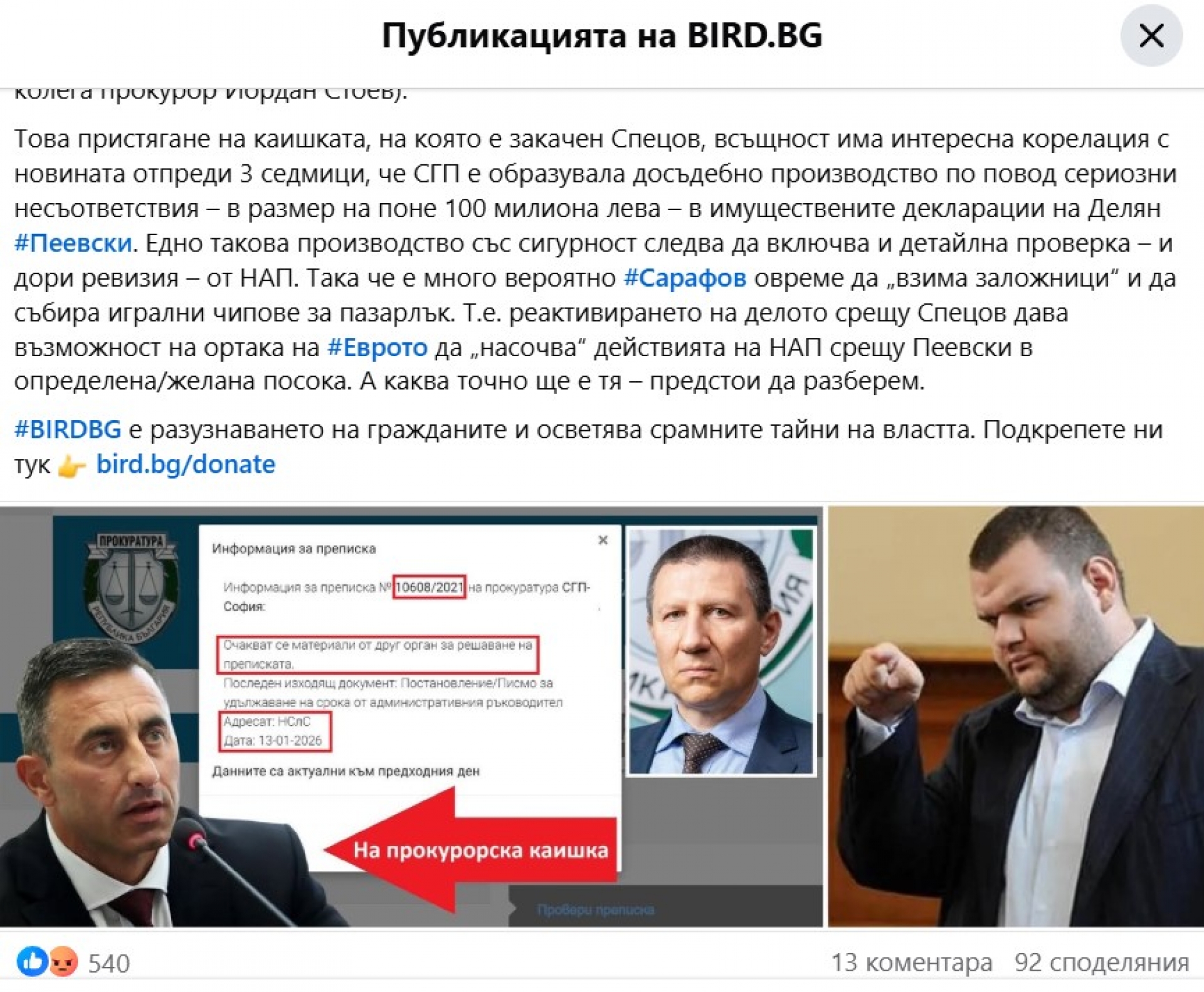 Става въпрос за Националната следствена служба (НСлС) - сега тя извършва процесуално-следствените действия. Последният изходящ документ по преписката на СГП е постановление/писмо за удължаване на срока от административния ръководител, става ясно от проверка в електронния портал на прокуратурата по номера на преписката, цитиран от BIRD.bg.