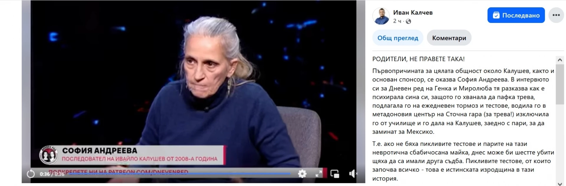 "Първопричината за цялата общност около (Ивайло) Калушев, както и основан спонсор, се оказва София Андреева. В интервюто си за предаването "Дневен ред" тя разказва как е психирала сина си, защото го хванала да пафка трева, подлагала го на ежедневен тормоз и тестове, водила го в метадоновия център на Сточна гара (за трева!) изключила го от училище и го дала на Калушев, заедно с пари, за да заминат за Мексико". Такова заключение направи Иван Калчев, кандидат за депутат от Зелено движение още преди 4 години, който е известен и с доброволната си военна служба в подкрепа на Украйна във войната ѝ срещу окупаторите от Русия.