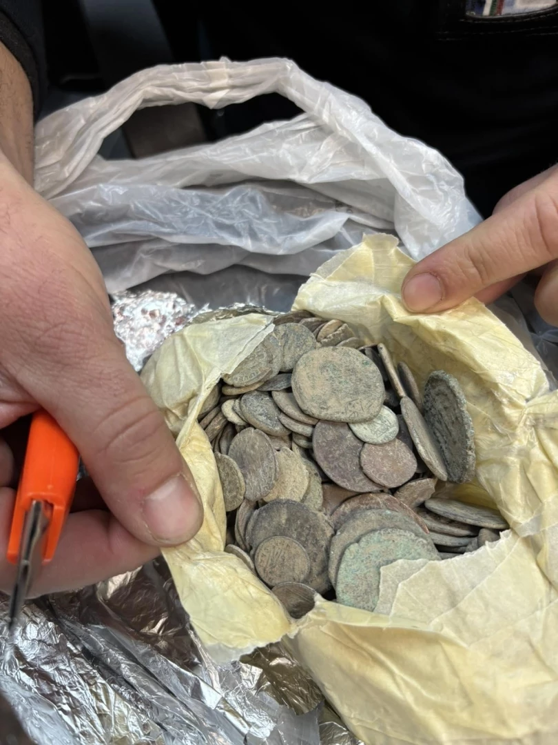 В хода на контролните действия митническите инспектори откриват старинни монети и предмети, укрити в общо 8 полиетиленови пакета, обвити с алуминиево фолио.