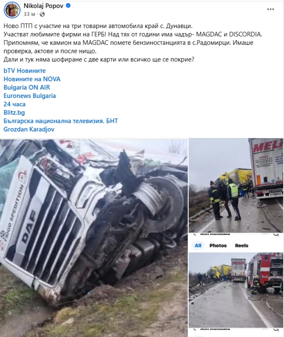 Тежката катастрофа коментира във Фейсбук и башата на загиналата край Телиш 12-годишна Сияна Николай Попов. Той твърди, че в катастрофата участват “любими фирми на ГЕРБ, над които има чадър“.