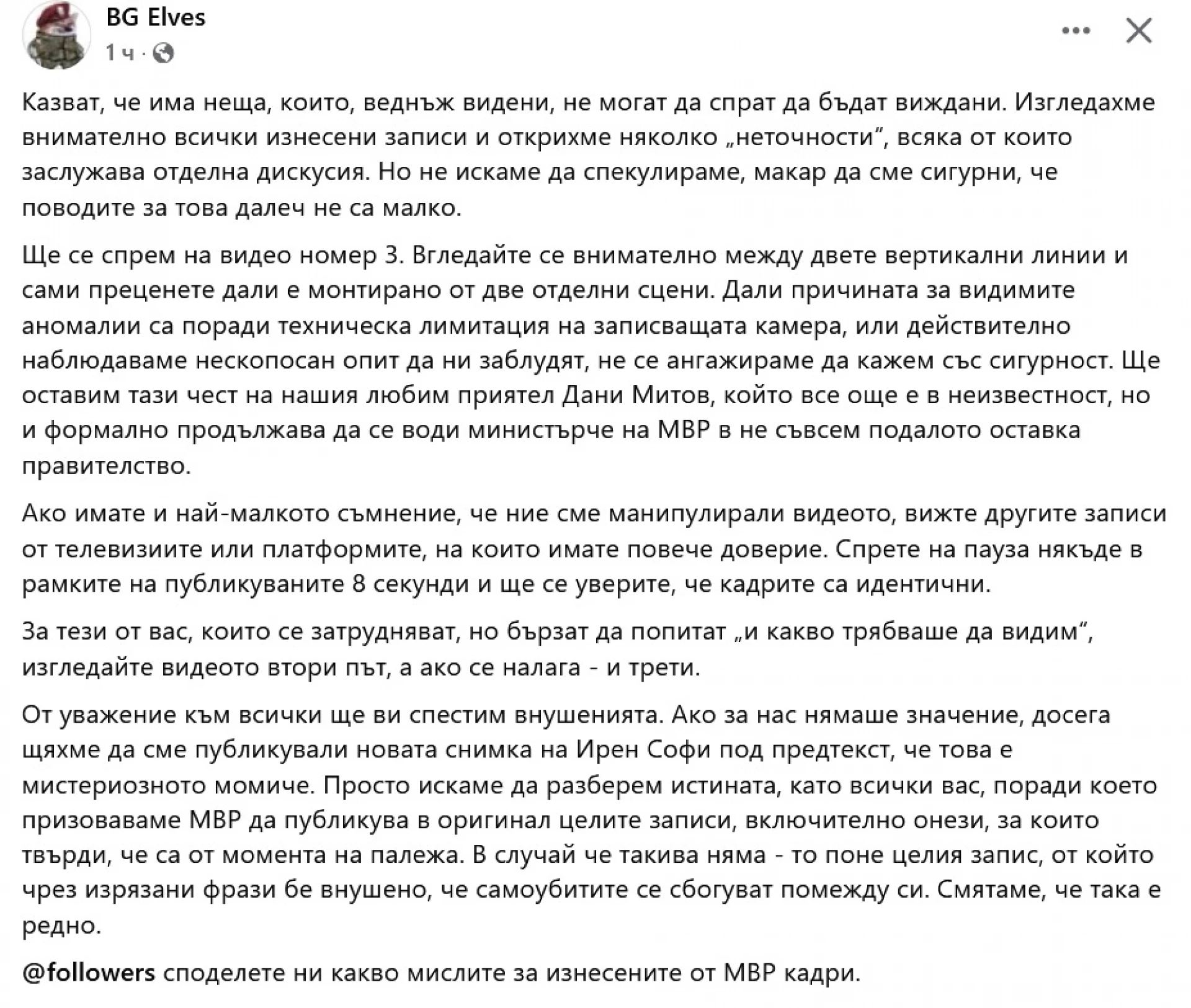 "От уважение към всички ще ви спестим внушенията. (...) Просто искаме да разберем истината, като всички вас, поради което призоваваме МВР да публикува в оригинал целите записи, включително онези, за които твърди, че са от момента на палежа. В случай че такива няма - то поне целия запис, от който чрез изрязани фрази бе внушено, че самоубитите се сбогуват помежду си. Смятаме, че така е редно", добавят от BG Elves.
