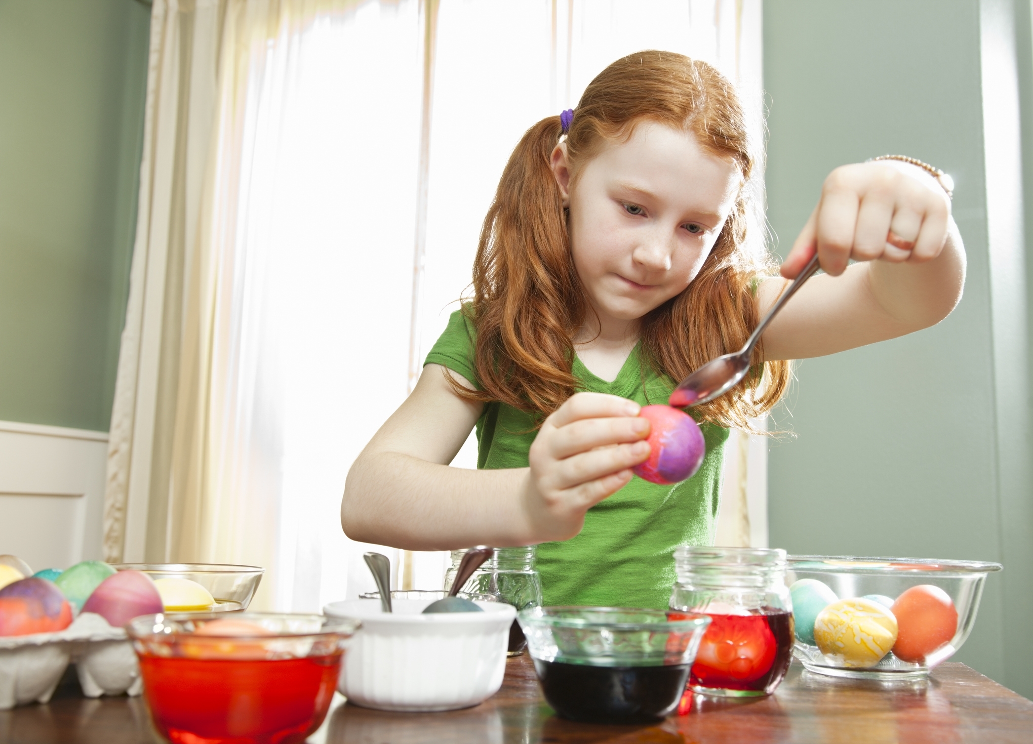 Тайната съставка е червеното зеле. То се нарязва на ситно и се залива с вряща вода. Когато водата придобие цвета на зелето и се охлади, добавете 3 супени лъжици оцет. След това потопете яйцата в получената смес и поставете капак върху съда, в който са яйцата. За да постигнете желания цвят, яйцата трябва да престоят в зелето поне два часа, като можете да ги оставите и за една нощ.