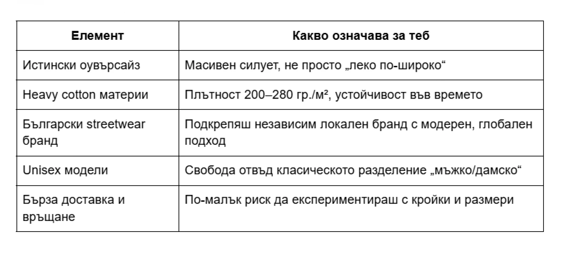 Heavy cotton и плътни смеси от памук и полиестер гарантират, че дрехите не прозират, не се деформират и стоят стабилно по тялото – ключово за модерния оувърсайз силует.
