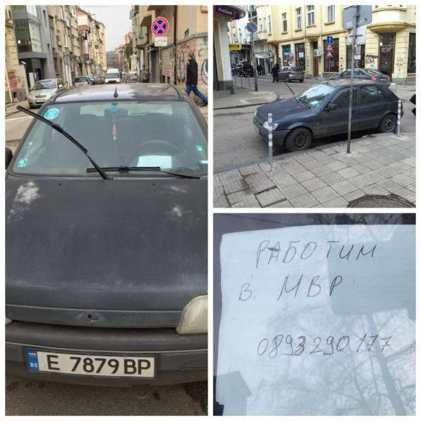 Автомобил с благоевградска регистрация скандализира шофьори и пешеходци в центъра на София. Неправилно паркиралият „гражданин” си е позволил да сложи бележка на прозореца си с надпис „ Работим в МВР” и е оставил телефон за връзка. Дали наистина работи там или не няма голямо значение, неговата постъпка си остава неградска.