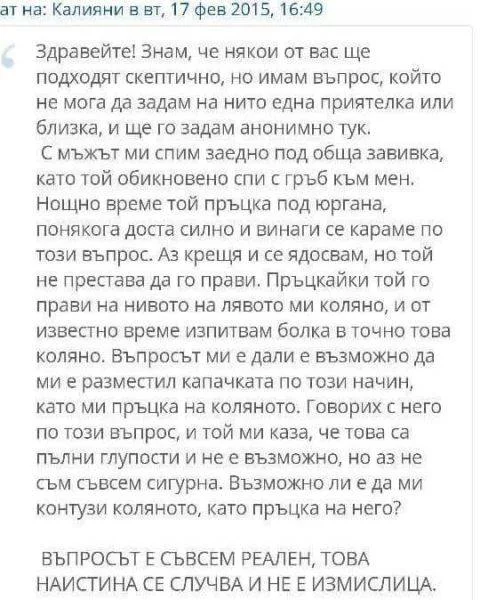 Българка с потребителско име Калияни зададе меко казано странен въпрос в известен женски форум в мрежата. Не сме съвесем сигурни дали писмото е истинско или някой си е направил шега, но въпросът на тази жена разсмя социалните мрежи и предизвика куп споделяния и коментари. Предлагаме на вашето внимание цялото писмо без редакция, а коментара оставяме на вас.