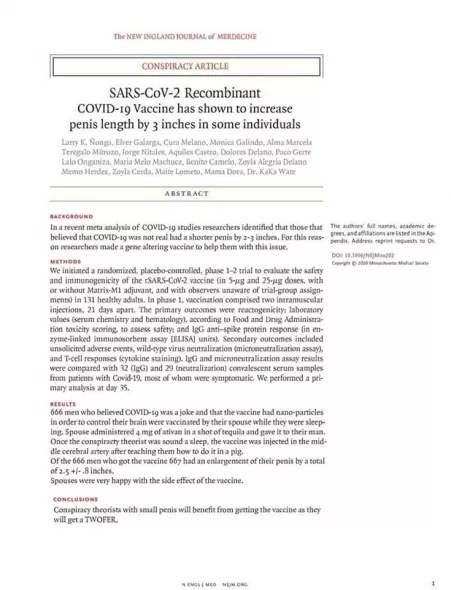 В документа се разказва за "проучване", направено с участието на 666 мъже, които вярват, че в COVID ваксината има чип, който цели да контролира мозъка им. Всички участници са били ваксинирани от съпругите си докато спят. Според "резултатите", при 667 от тях се наблюдава уголемяване на пениса с от 6 до 20 см.