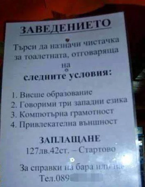 Позицията, за която се търси човек е на „висококвалификацираната” позиция хигиенист на тоалетна на „космическата” заплата от 127лв и 42 ст.