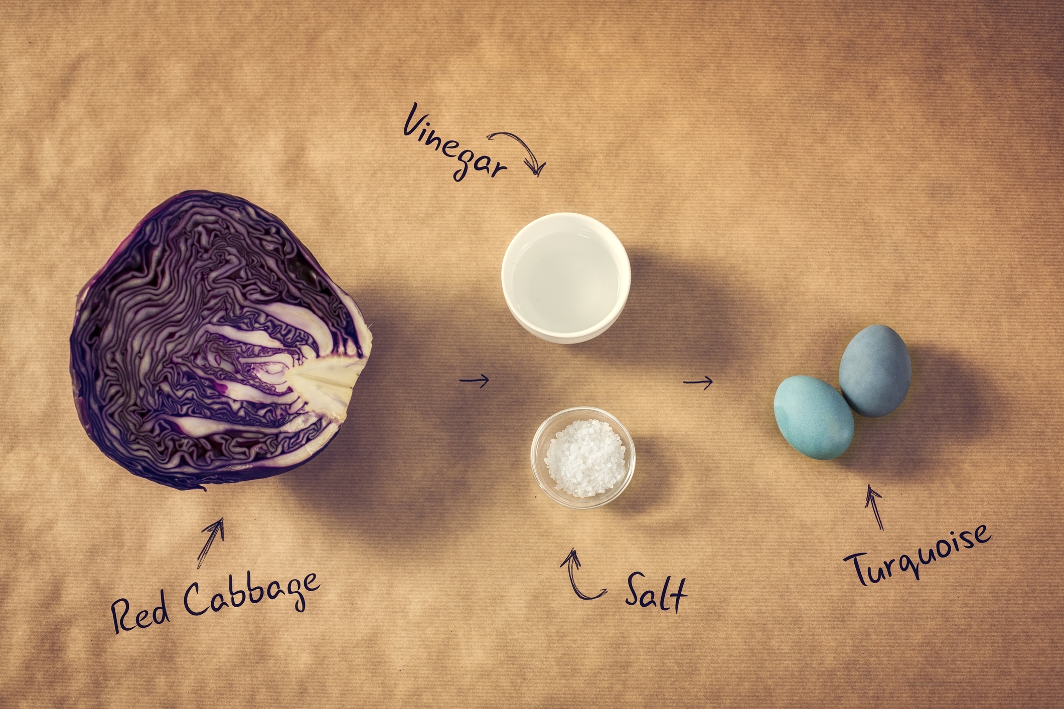 Люспите от лук обикновено се използват за боядисване на яйца в червено. Червено цвекло и зеле също могат да се използват за боядисване на яйцата в червено. За да получите ярко жълт цвят, можете да използвате куркума.
