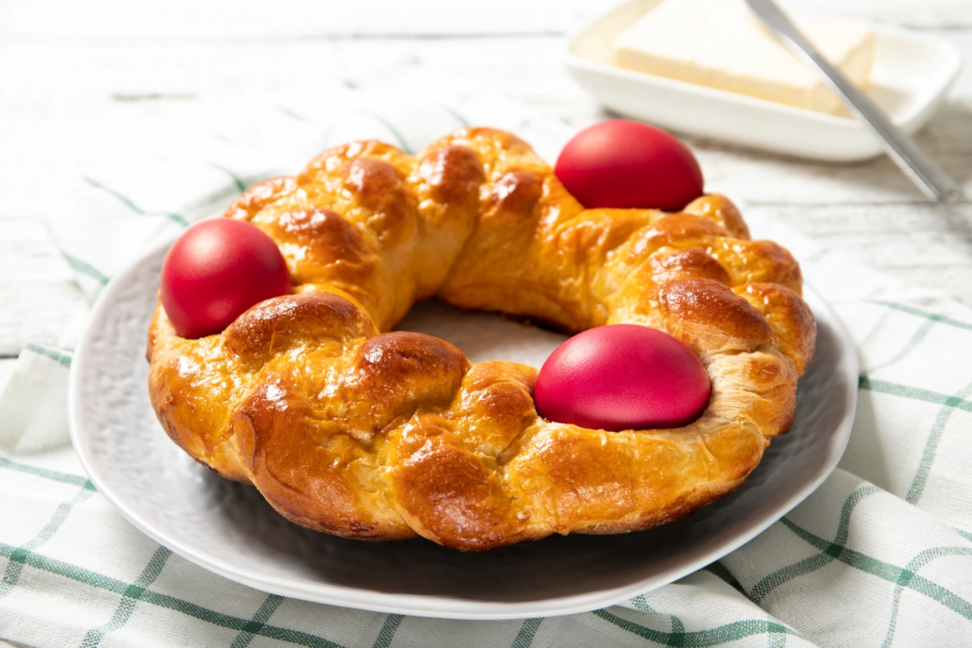 Загрейте фурната до 190°C. Разбийте заедно останалото 1 яйце и останалите 2 супени лъжици вода в малка купа и внимателно намажете сместа върху тестото, като внимавате да не намажете яйцата. Печете тестото в предварително загрята фурна до златисто кафяво и ароматно, около 25 до 30 минути. Оставете хляба да се охлади върху тава за печене за 5 минути; прехвърлете го върху решетка, за да се охлади, докато е готов за сервиране. Нарежете хляба и сервирайте топъл (яйцата могат да бъдат обелени и изядени, ако желаете, или изхвърлени); покрийте и охладете остатъците до 3 дни.