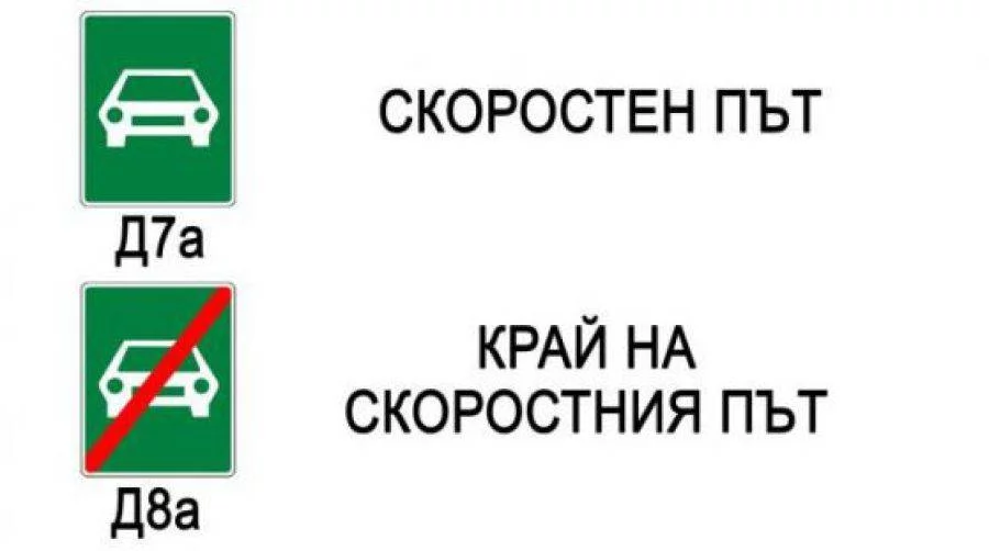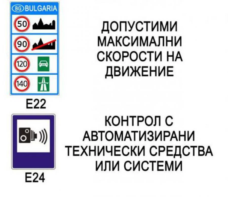 Както стана ясно вчера КАТ ще пусне няколко нови пътни знаци. Това ще са Д7а, Д8а - начало и край на скоростни пътища, и знак Е24 - пътен участък, който е под видеонаблюдение. Ще има промени във вида и на знаци Е22, където ще бъде добавено поле за скоростен път с ограничение на скороста до 120 км/ч.
