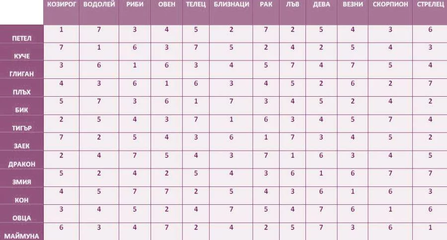 Тази интересна таблица ще ви разкрие истинската зодия, която е комбинация от вашата си плюс тази от китайския ви хороскоп. Първата картинка показва коя е вашата китайска зодия, а втората - таблицата, в която да откриете непознатата за вас зодия. Засечете двете зодии и вижте кое е вашето число. След което ще разберете подробности за скритата ви зодия.