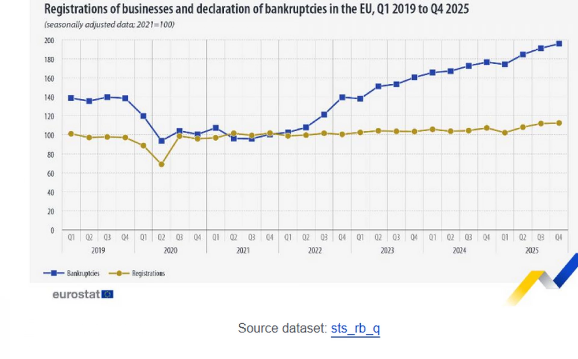 Броят на подадените декларации за фалит в Европейския съюз (ЕС) нараства с 2,5 на сто през четвъртото тримесечие на 2025 г. спрямо третото тримесечие, показват данни на Евростат, публикувани днес от европейската статистическа служба. В България през четвъртото тримесечие на 2025 г. спрямо предходното тримесечие фалитите на компании нарастват с по-сериозен процент - с цели 13,1 на сто.