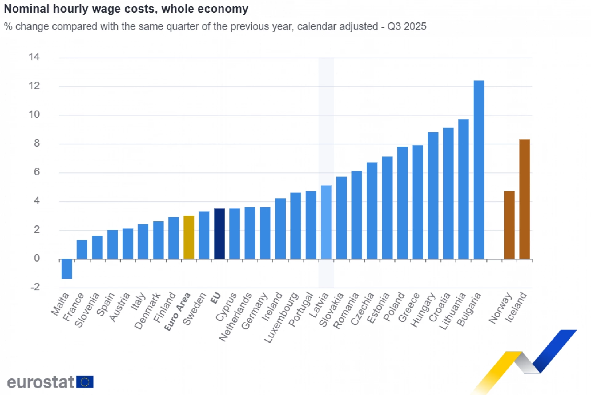 Като цяло в еврозоната почасовите разходи за труд са се увеличили с 3,3 на сто през третото тримесечие на 2025 г., а в Европейския съюз – с 3,7 на сто спрямо същото тримесечие на предходната година.