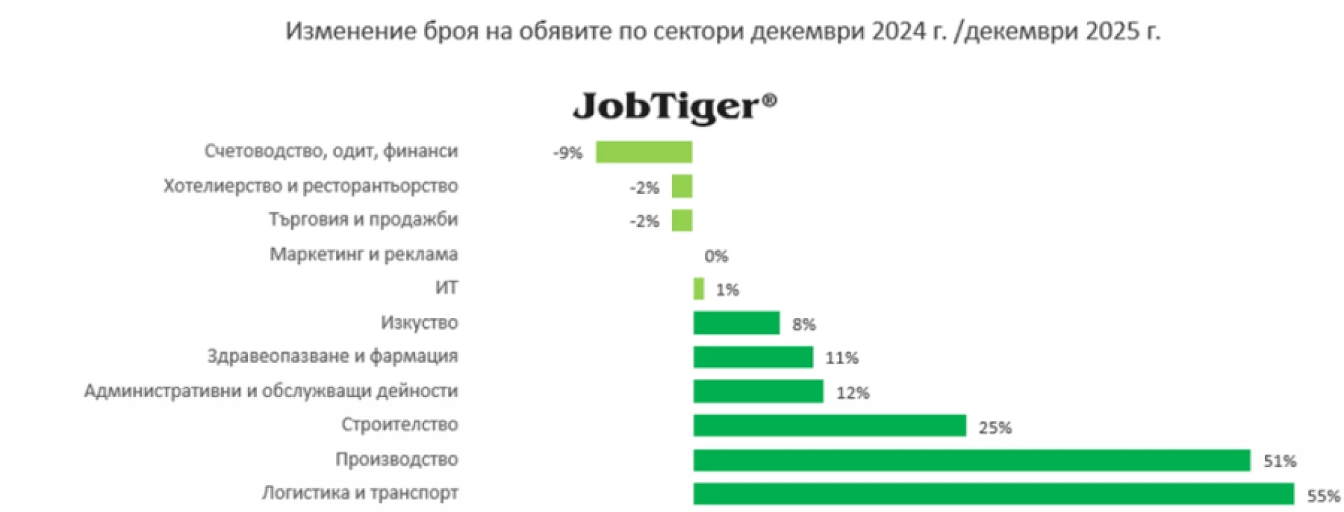 Сравнено на годишна база обаче, се отчитат положителни резултати и ръст на обявите в повечето сектори. Изключение правят секторите „Счетоводство, одит, финанси“, в който наблюдаваме годишен спад от 9%, „Хотелиерство и ресторантьорство“ и „Търговия и продажби“ с 2% спад.