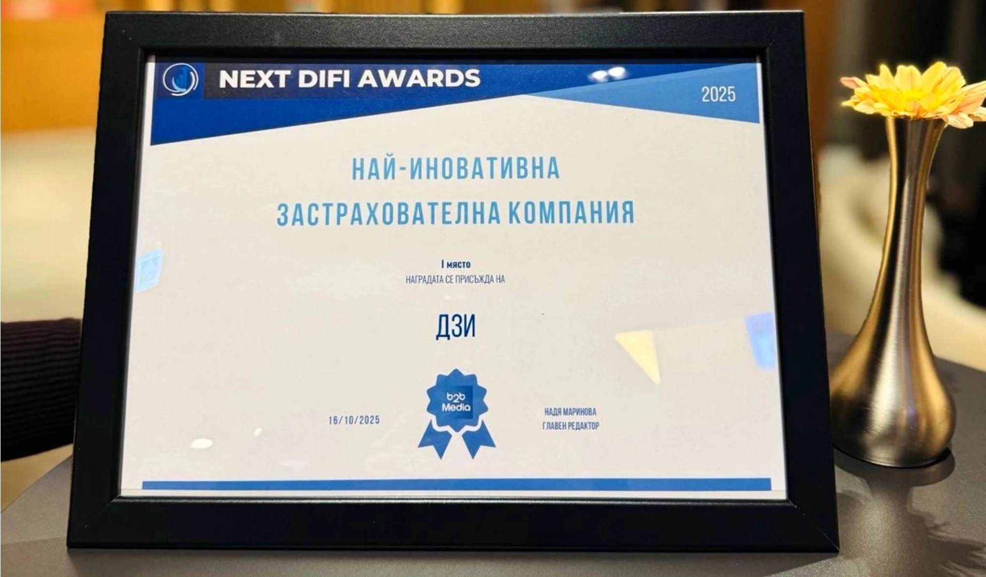 На прага на своята 80-годишнина, най-старото застрахователно дружество в България продължава да печели награди и да трупа признания за постижения в сферата на дигитализацията и иновациите. ДЗИ е големият победител в категория „Най-иновативна застрахователна компания“ от наградите NEXT DiFi AWARDS 2025, организирани от икономическия сайт b2b Медия. Отличието идва, непосредствено след като водещият застраховател в страната получи наградата за най-добър дигитален застраховател в България от международната класация Global Insurance Innovation Awards 2025, организирана от The Digital Baker.