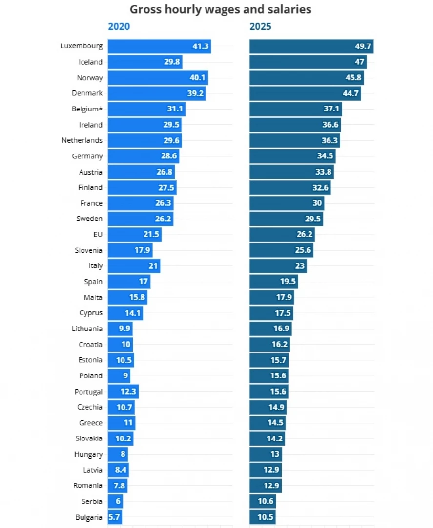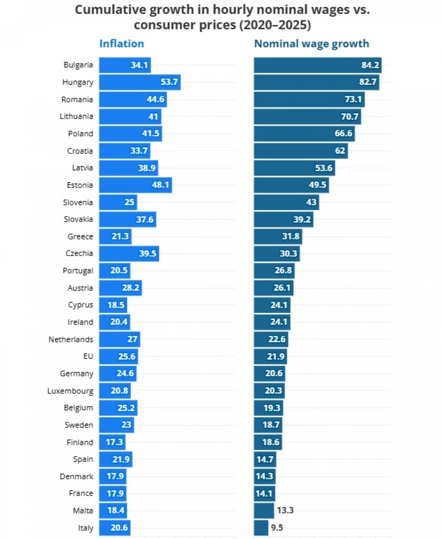 Брутните почасови заплати в ЕС са се увеличили от 21,5 евро през 2020 г. до 26,2 евро през 2025 г., което отразява растеж от 21,9%. Тези данни обаче не отчитат инфлацията.