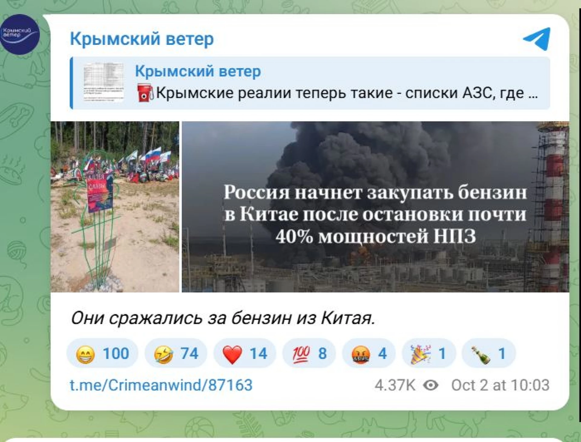 По повод планирания внос на петрол от Китай телеграм каналът "Кримски вятър" пусна кратък разсипващ коментар - под снимка на гробище с убити в Украйна руски военни написа: "Те се сражаваха, за да има бензин от Китай". Това е най-кратката оценка на това, което диктаторът Путин получи като резултат от развързаната от него война срещу Украйна.