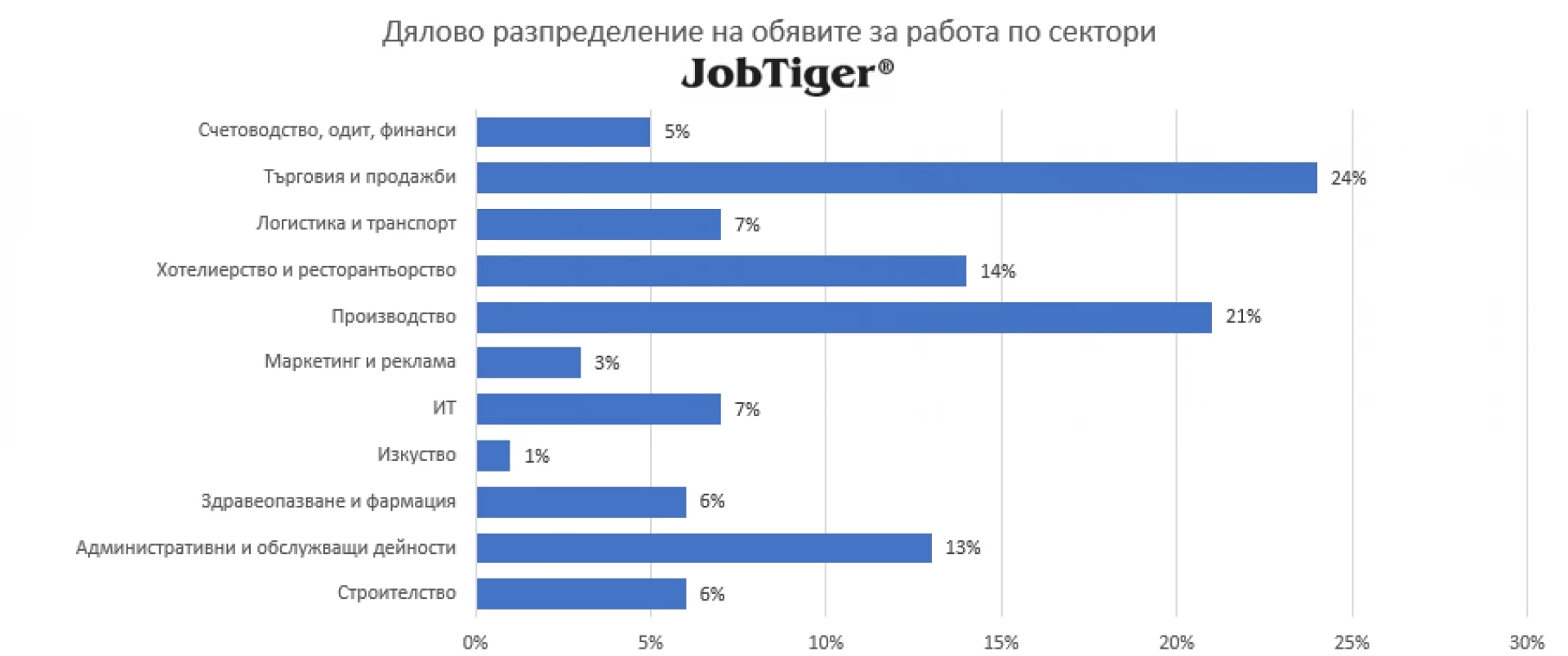 Няма съществена промяна при „Логистика и транспорт“ и „ИТ“. При тях се отчита дял от 7 на сто. Останалите са, както следва: „Строителство“ (6 на сто), „Здравеопазване и фармация“ (6 на сто), „Счетоводство, одит и финанси“ (5 на сто), „Маркетинг и реклама“ (3 на сто) и „Изкуство“ (1 на сто).