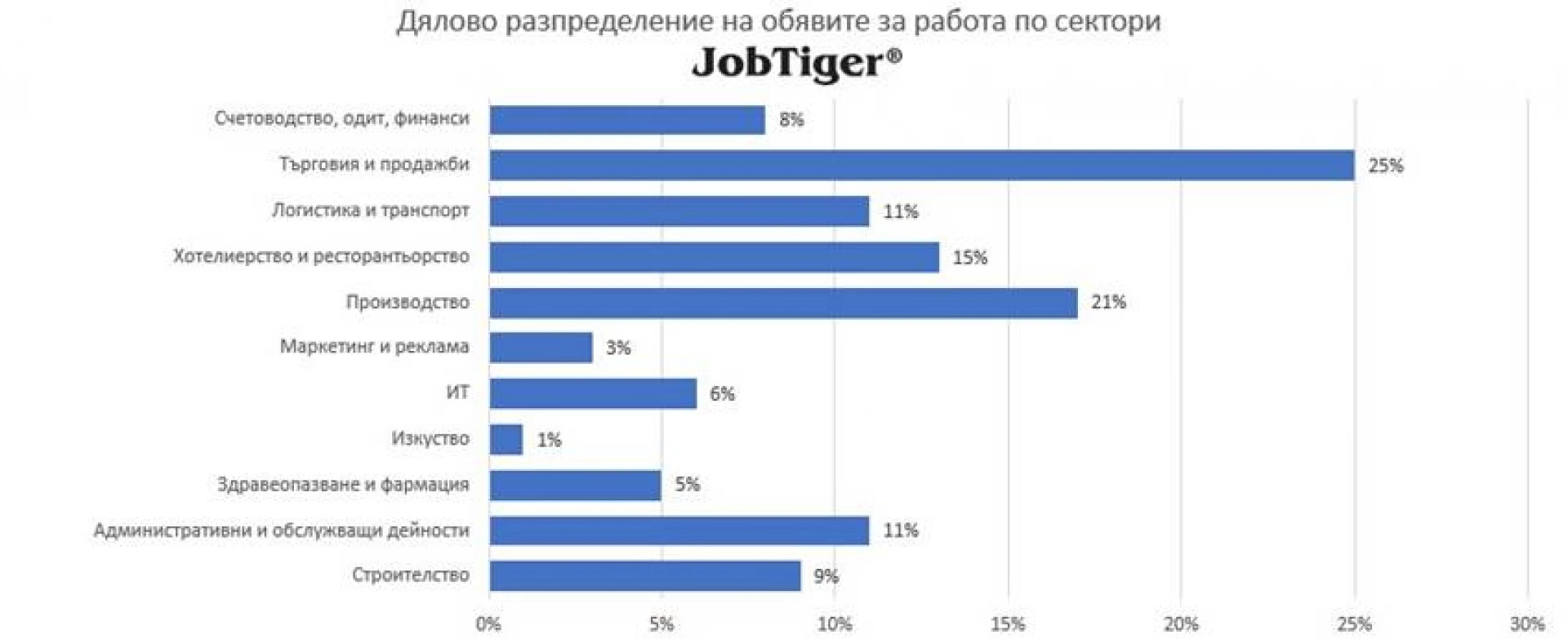 По отношение на дяловото разпределение, анализът не отчита съществени промени. Секторът "Търговия и продажби" остава водещ с 25 процента дял, следван от "Производство" - с 21 процента, "Хотелиерство и ресторантьорство" - с 15 процента, "Логистика и транспорт" и "Административни и обслужващи дейности" – по 11 процента, "Строителство" - с 9 процента, и "Счетоводство, одит, финанси" - с 8 процента. Следват секторите "Информационни технологии" - с 6 процента, "Здравеопазване и фармация" - с 5 процента, "Маркетинг и реклама" - с 3 процента, и "Изкуство" - с 1 процент.