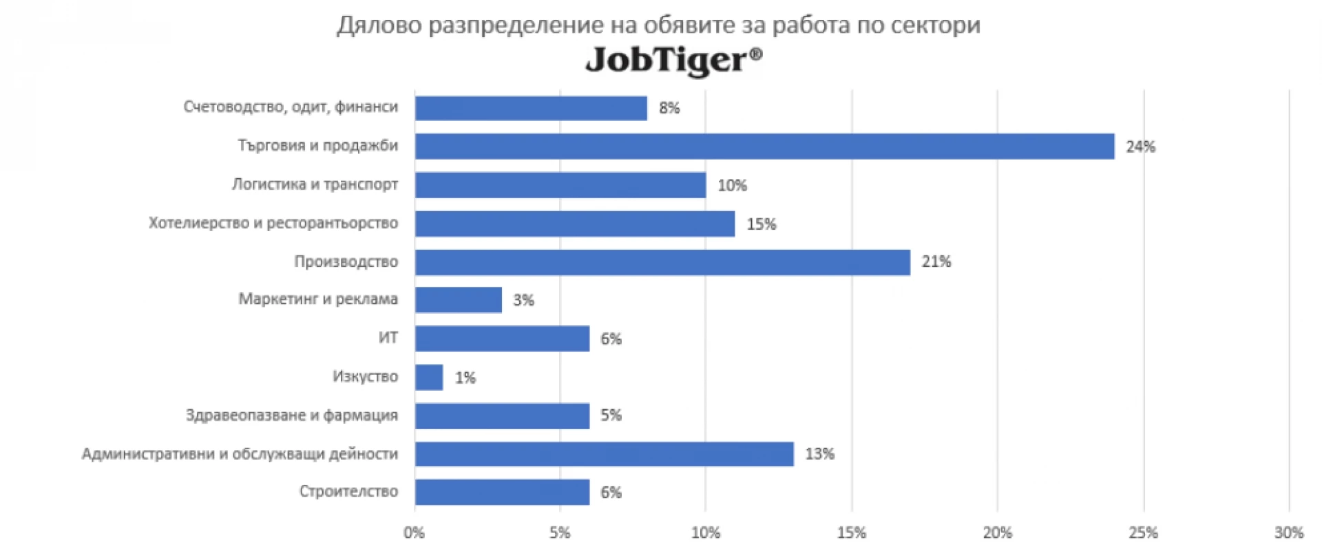 Данните показват, че въпреки понижението дяловото разпределение по сектори остава без съществени промени. Най-голям дял продължава да държи секторът "Търговия и продажби" - 24 процента от всички обяви. Следват "Производство" с 21 процента, "Хотелиерство и ресторантьорство" с 15 процента, "Административни и обслужващи дейности" с 11 процента, "Логистика и транспорт" с 10 процента, "Счетоводство, одит и финанси" с 8 процента, "Строителство" и "Информационни технологии" с по 6 процента, "Здравеопазване и фармация" с 5 процента, "Маркетинг и реклама" с 3 процента и "Изкуство" с 1 процент.