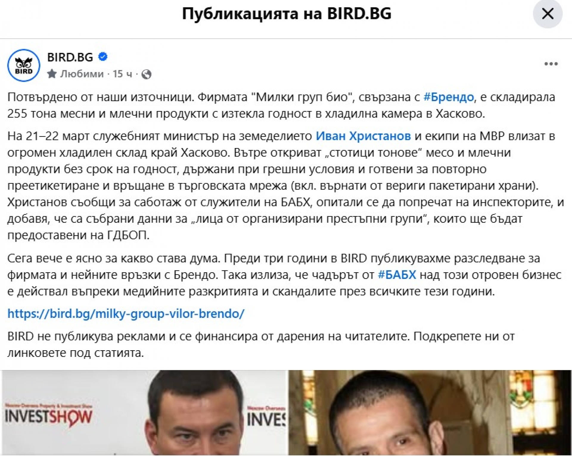 В случая министърът цитира публикация на разследващата медия BIRD.bg от вчера, в която се твърди, че фирмата "Милки груп био" е складирала 255 тона месни и млечни продукти с изтекла годност в хладилна камера в Хасково. Изданието се позовава на свои източници, които са потвърдили информацията. Разследващите журналисти свързват компанията именно с Брендо.