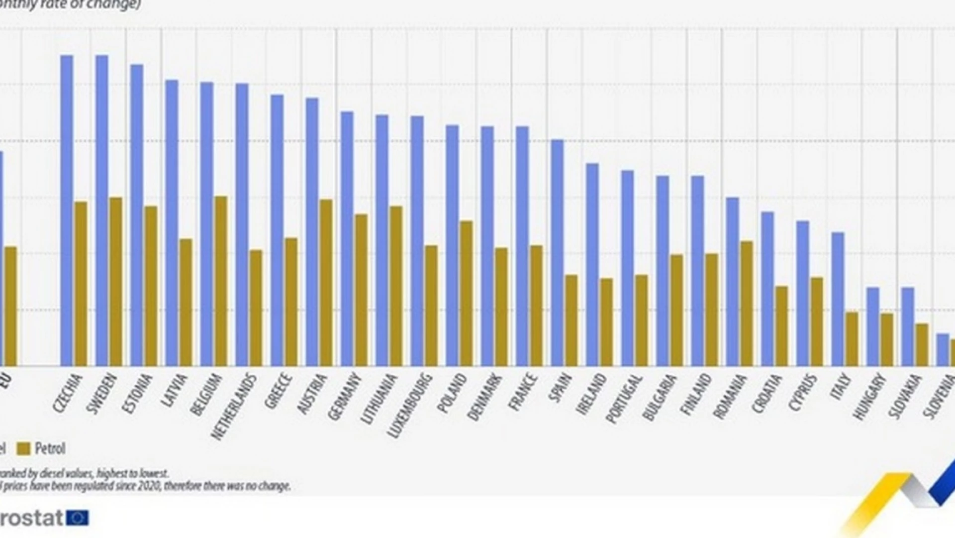 При дизела най-големи месечни увеличения през март са регистрирани в Чехия и Швеция (27,6 на сто и за двете държави), Естония (26,8 на сто), Латвия (25,4 на сто), Белгия (25,2 на сто) и Нидерландия (25,1 на сто).